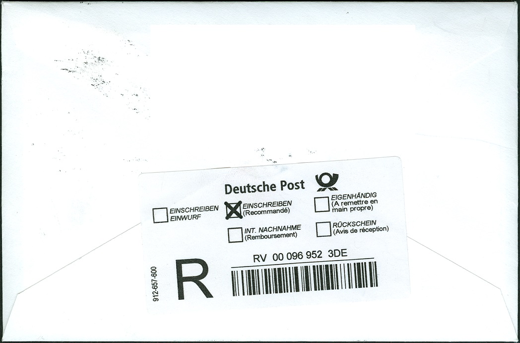 Das rückseitige deutsche Einschreiblabel bestätigt den Grenzübergang Schweiz - Deutschland. Absender und Empfänger wurden hier unkenntlich gemacht.