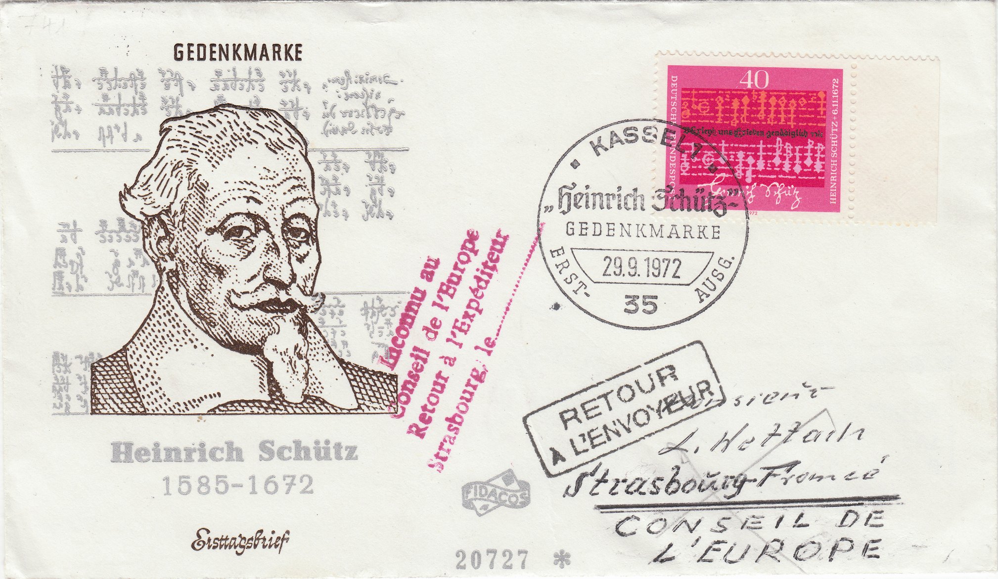 Der Beleg wurde als Ersttagsbrief der Gedenkmarke "Heinrich Schütz" am 29.09.1972 mit einem ESST in Kassel abgeschickt.