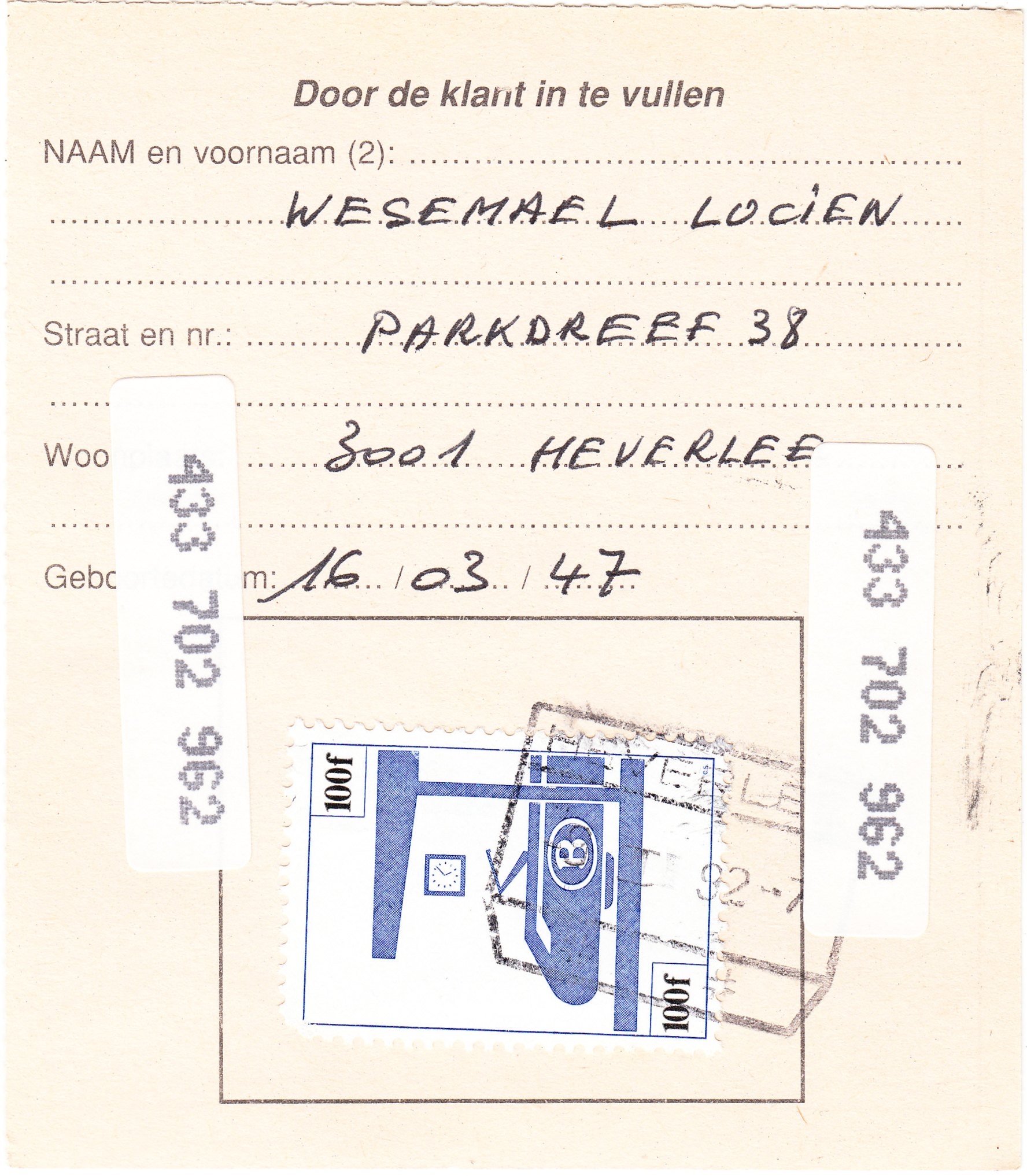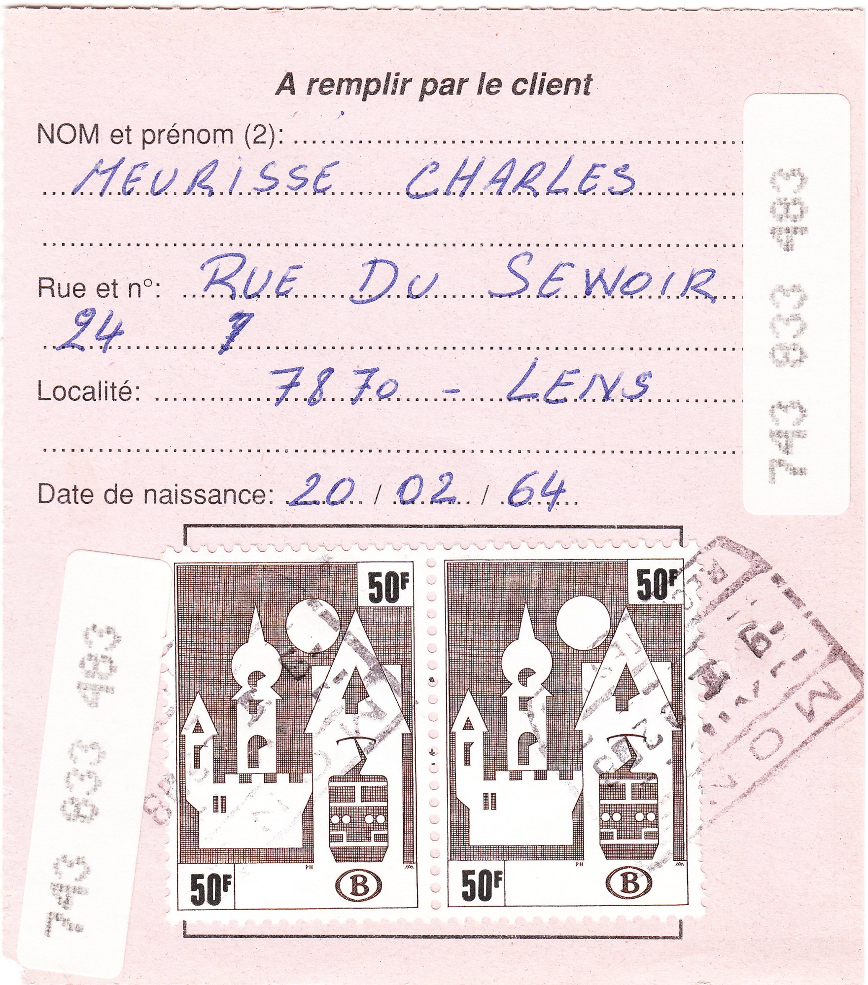 Die Gebühr für die Erstellung einer solchen Berechtigungskarte betrug 100 belgische Francs, die hier in Form eines Paars der Wertstufe 50 Francs verklebt und in MONS gestempelt wurde.