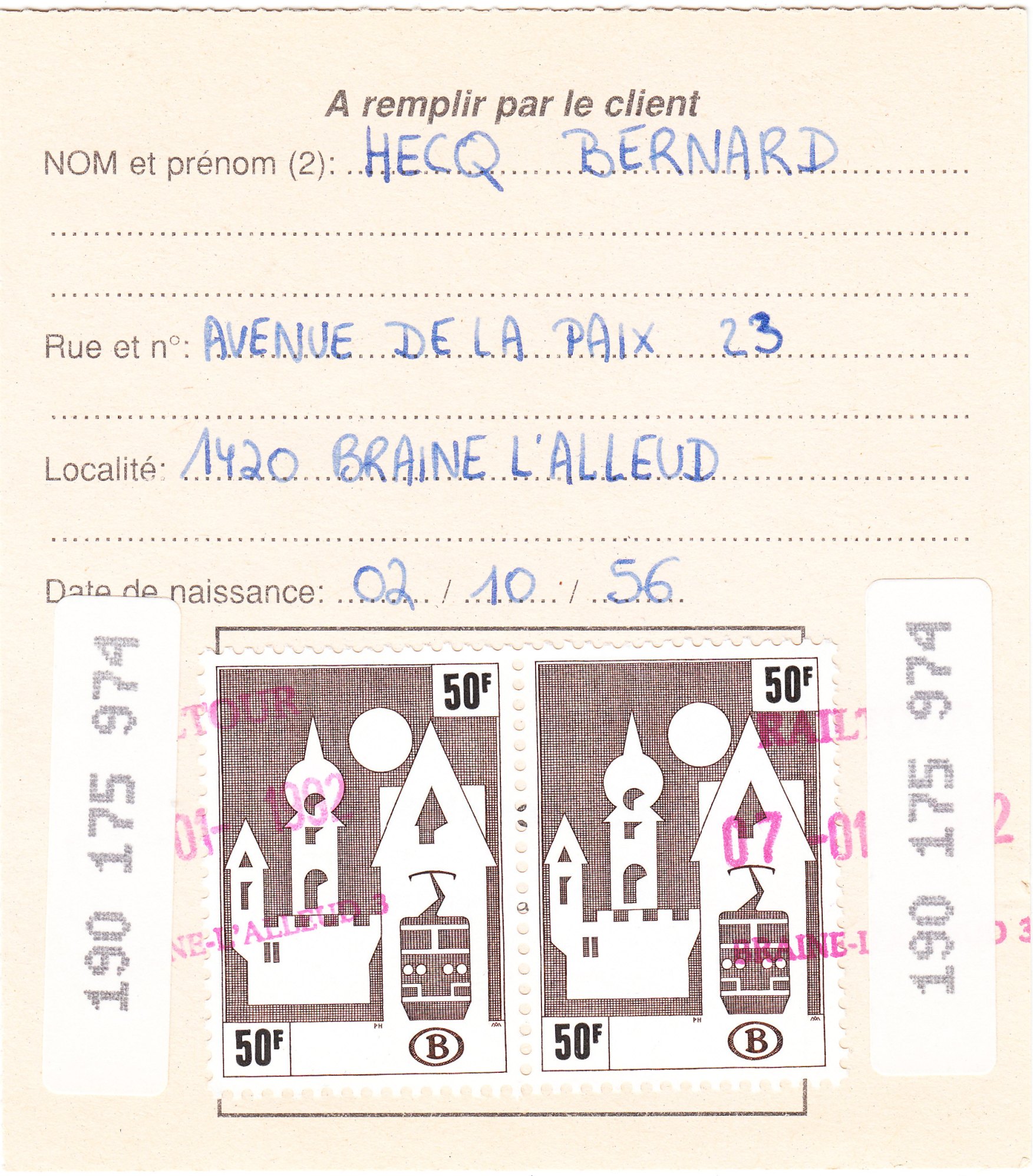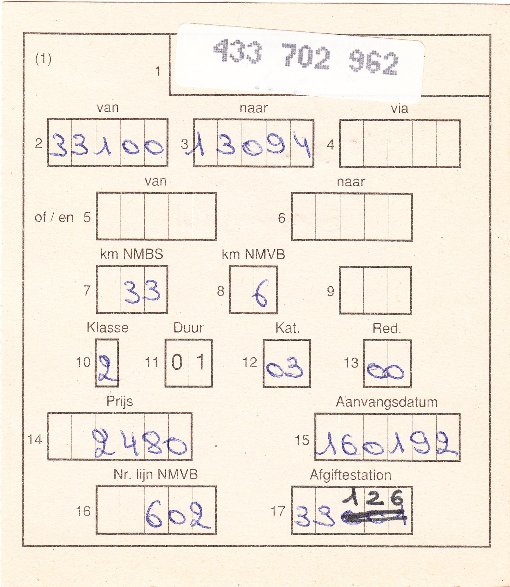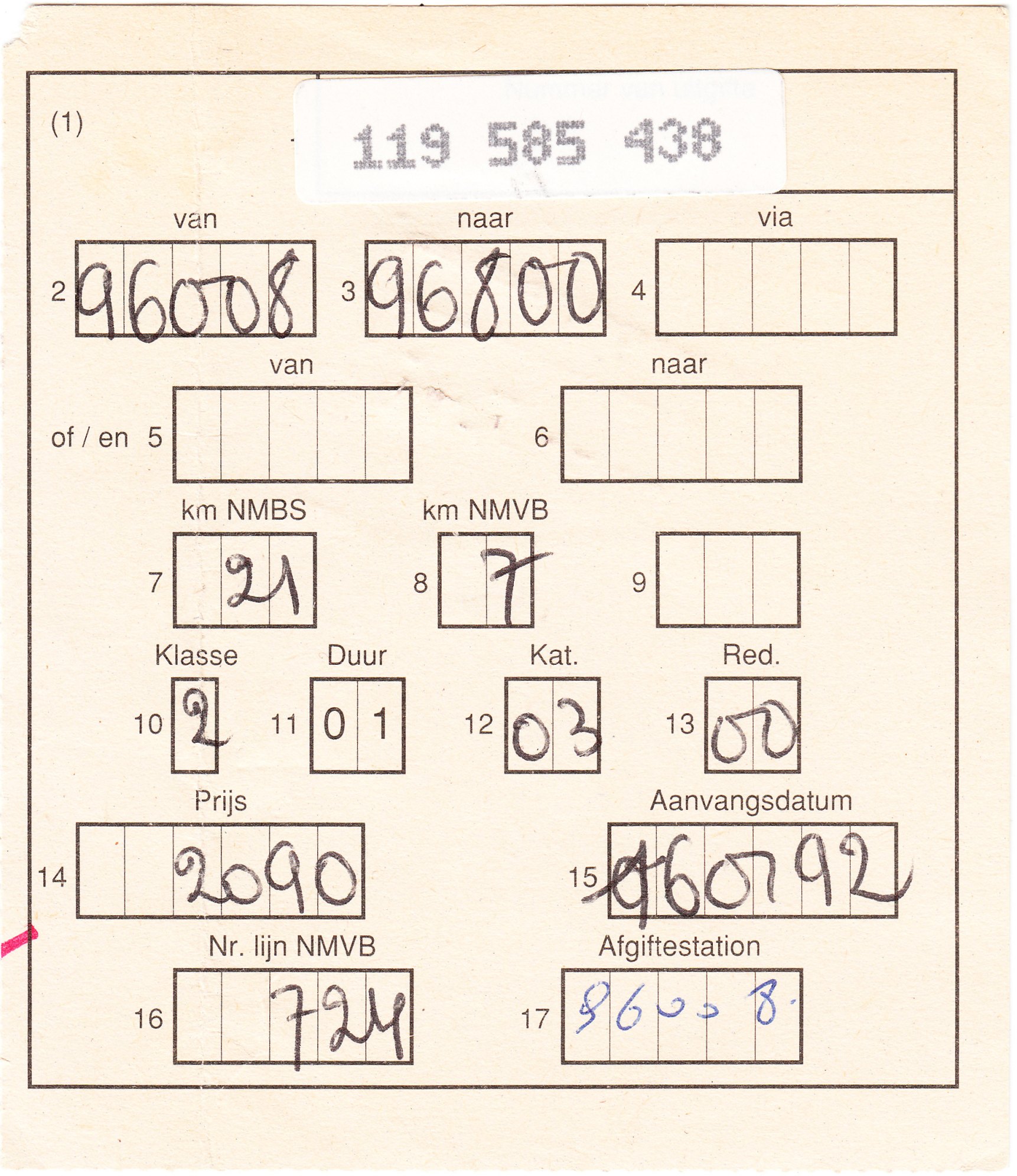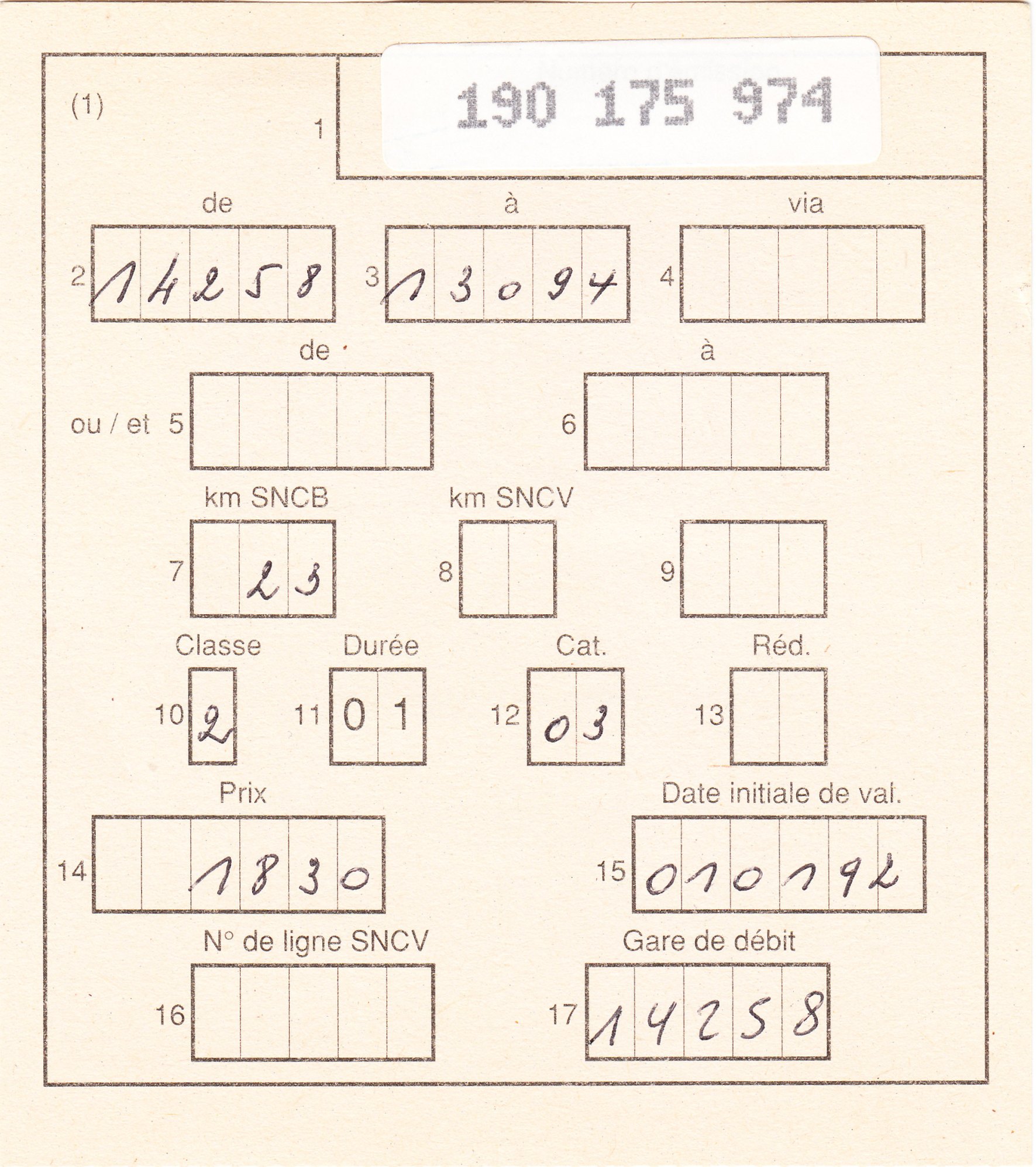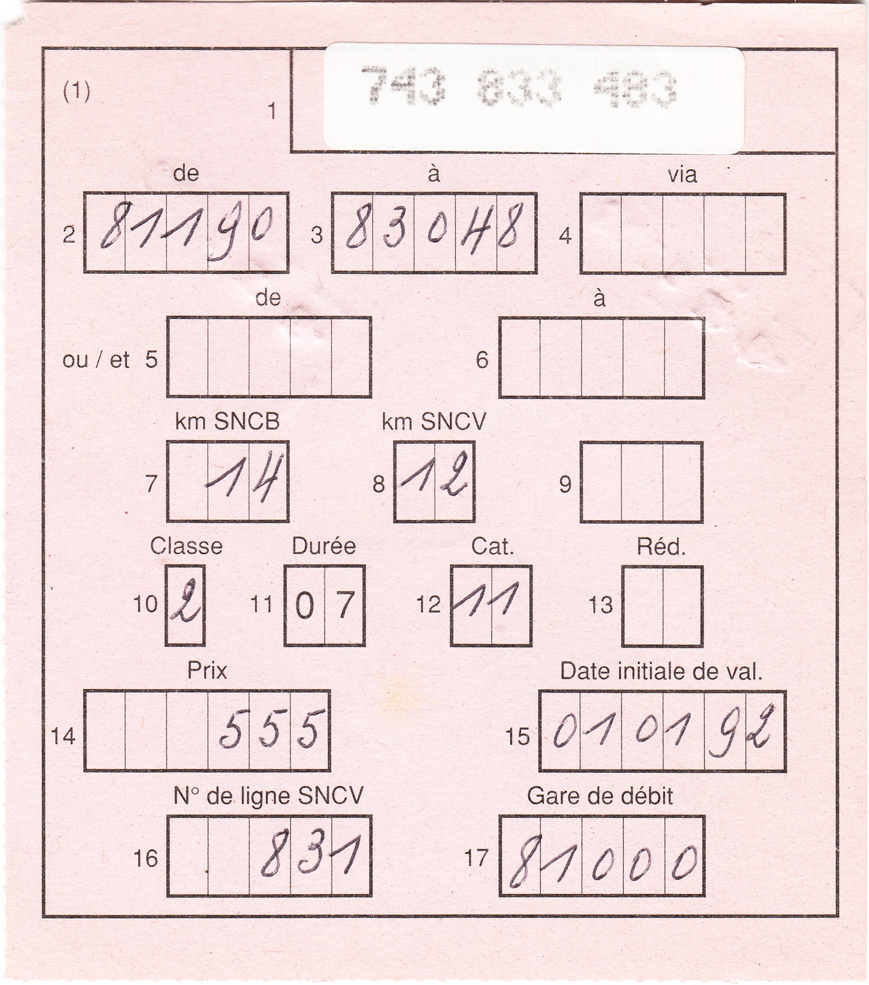 In diesem Falle handelt es sich um einen rosa Vordruck in französischer Sprache, gültig ab dem 01.01.1992 für 14 km Strecke der SNCB sowie 12 km Strecke der SNCV = Straßenbahn von den Bahnhöfen "81190" nach "83048".