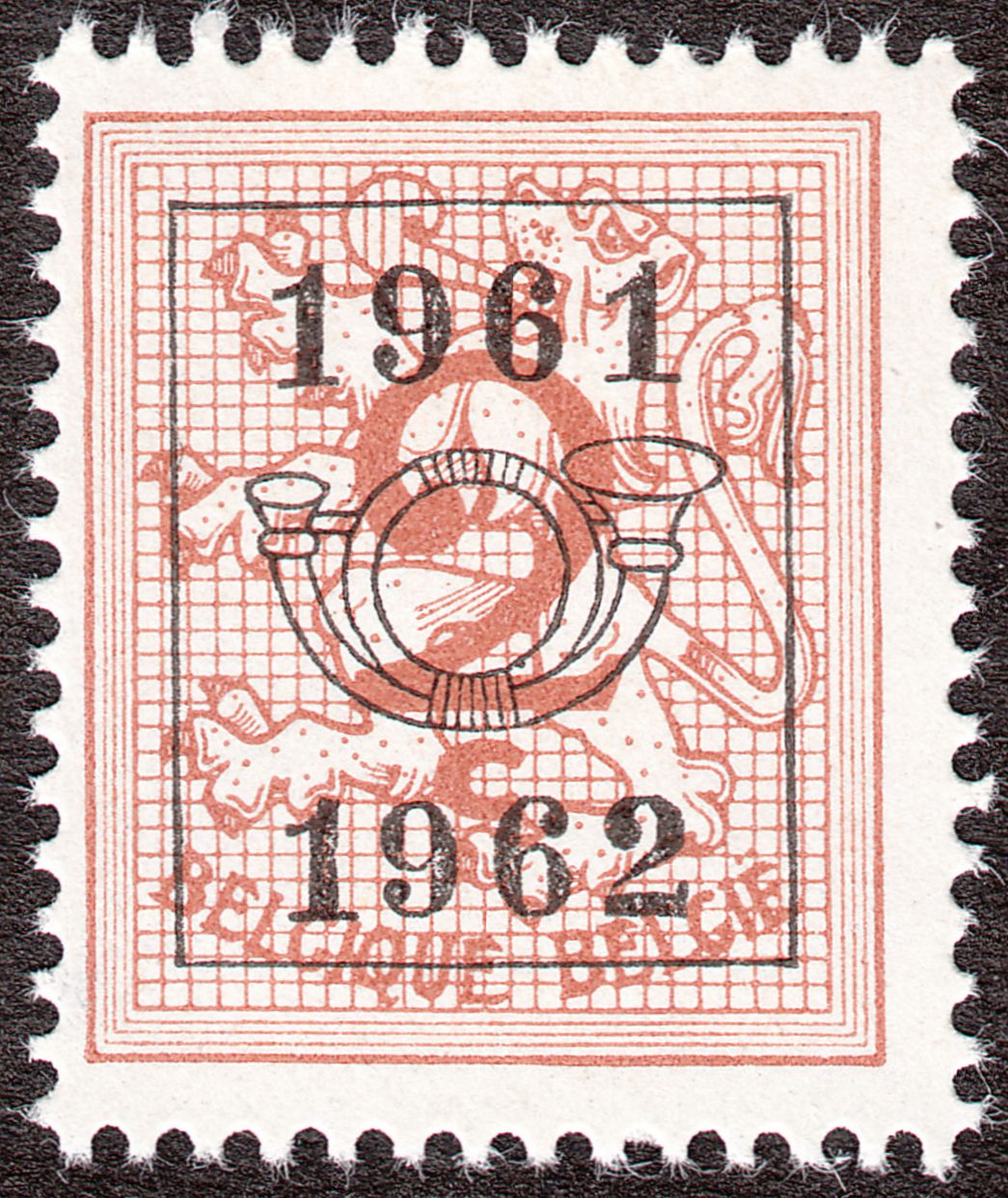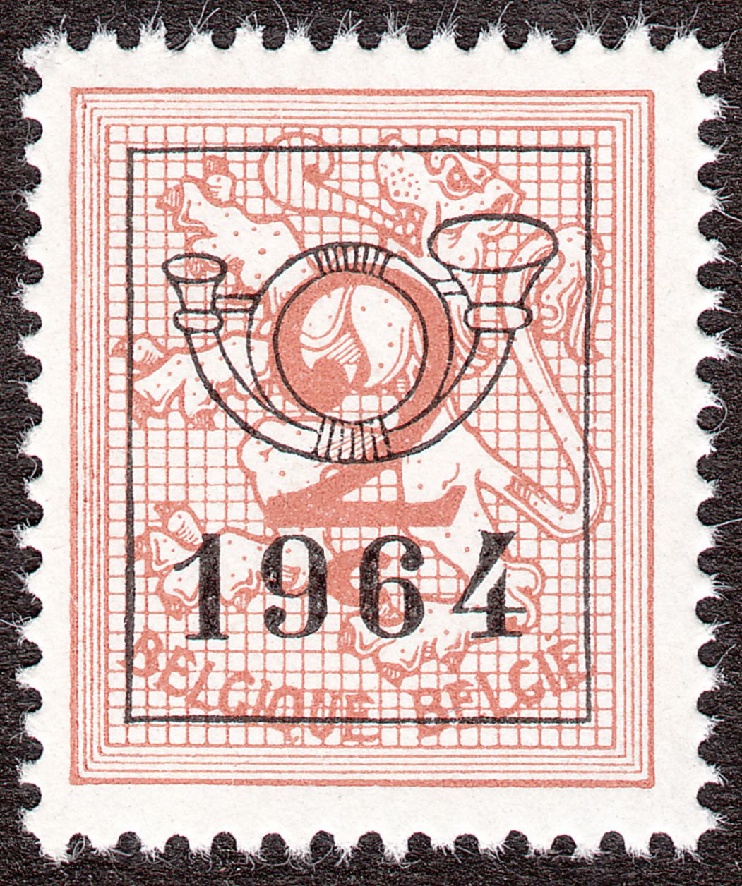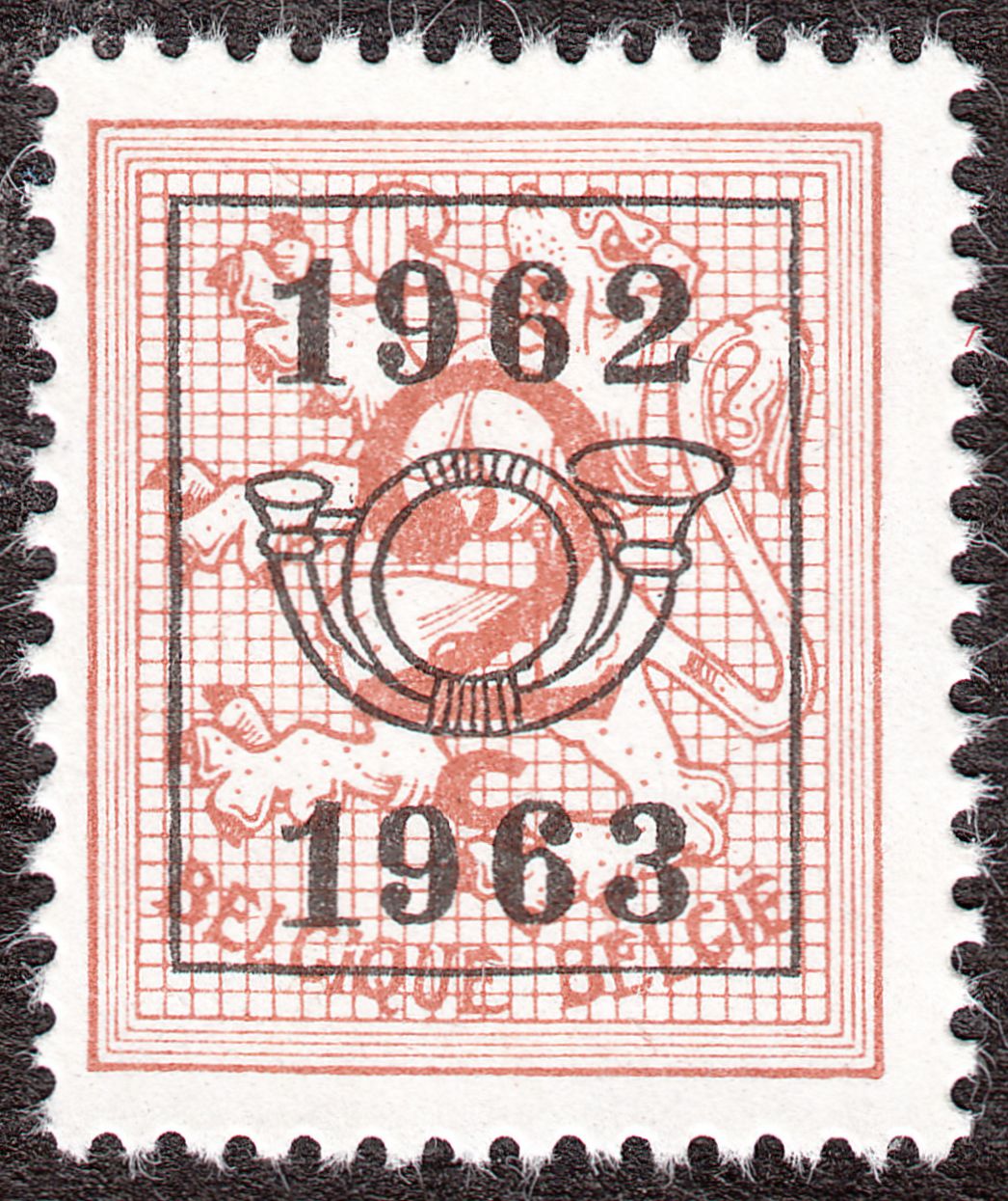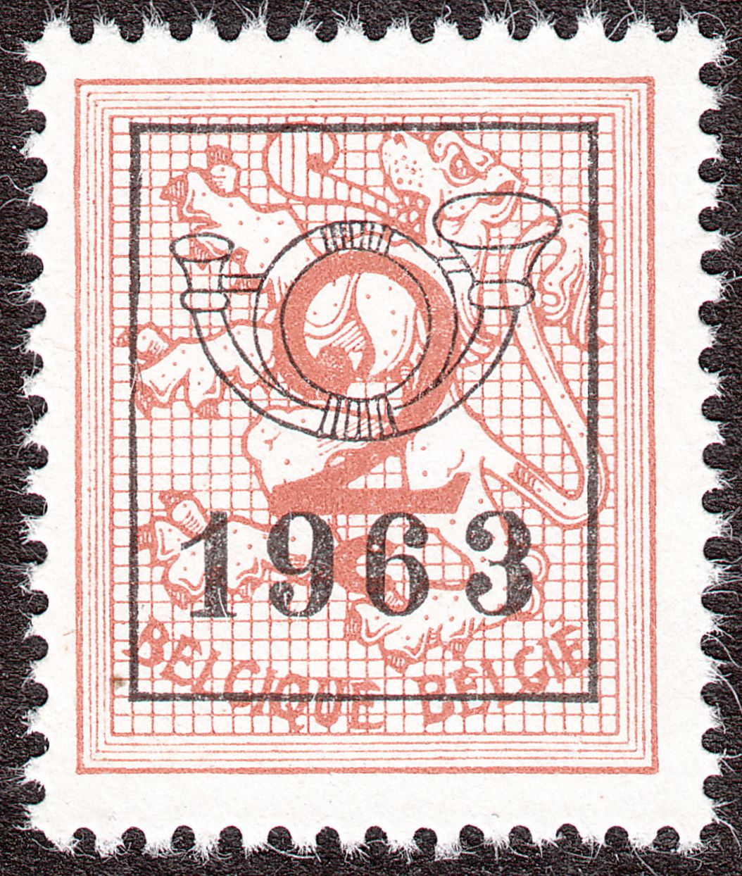 Mit dem Aufdruck der Vorausentwertung in Buchdruck in der Aufdrucktype b 6 wurde daraus von 1959 bis 1966 die Belgien MiNr. 1174 x A V I, hier ein Exemplar von 1963: