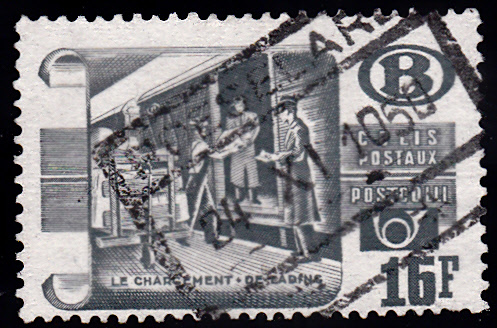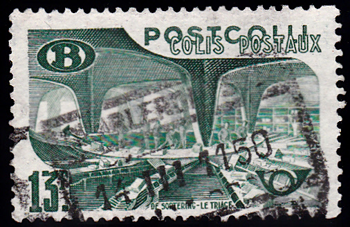 Aus der Serie "Postalltag" aus dem Jahre 1950 stammt diese Postpaketmarke zu 13 Francs mit dem Motiv "Paketsortierung". Sie ist unter der MiNr 31 katalogisiert. Die Marke gibt es in zwei Zähnungen: A = gez. L 12 1/2, C = gez. L 12:12 1/2.