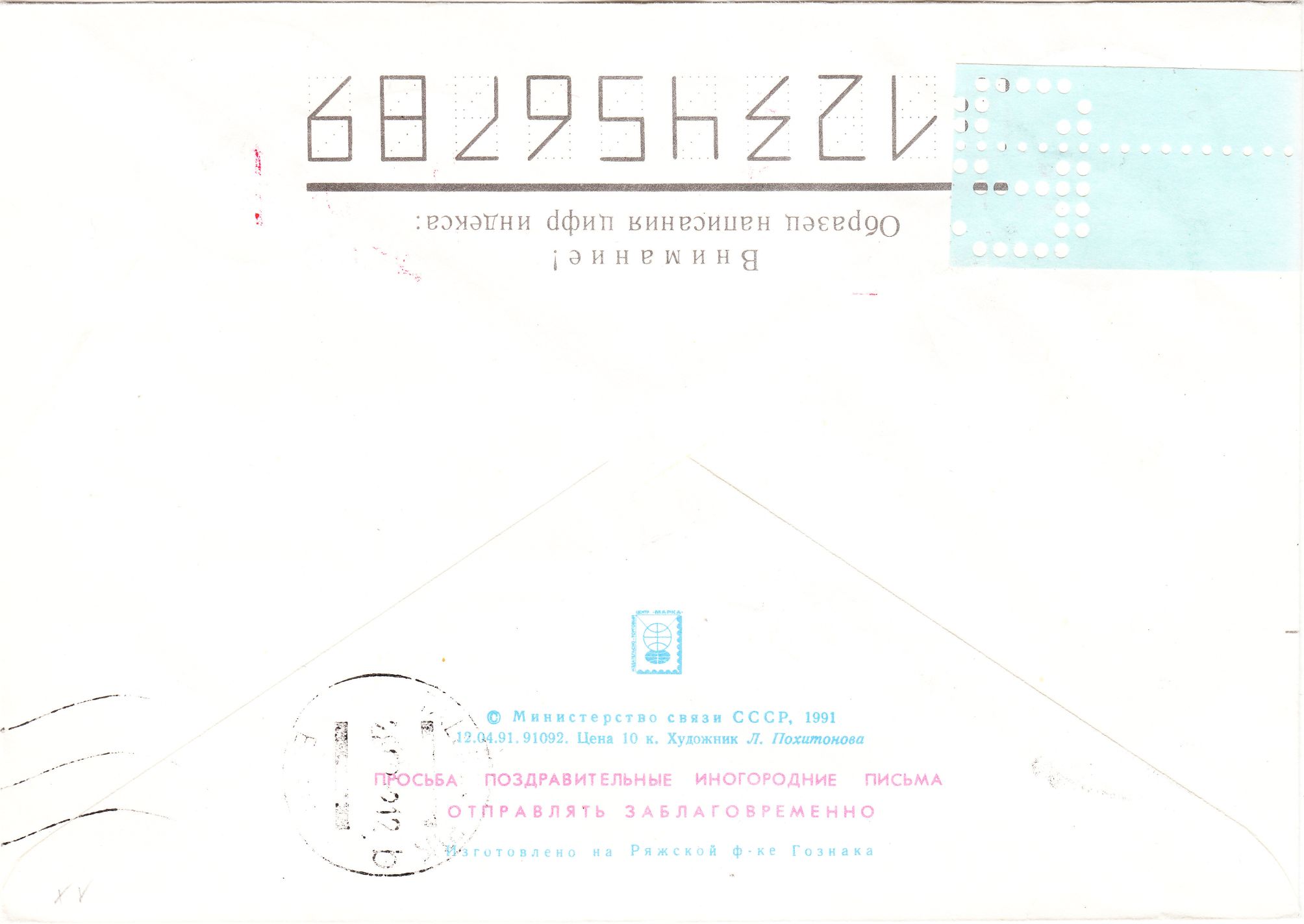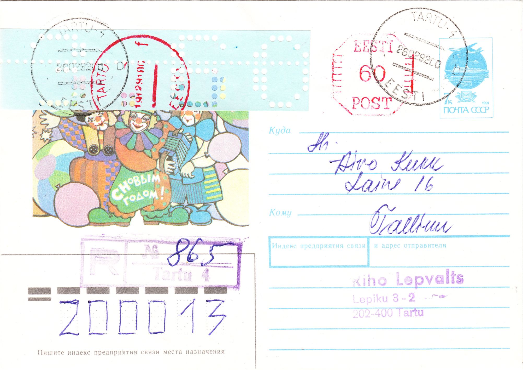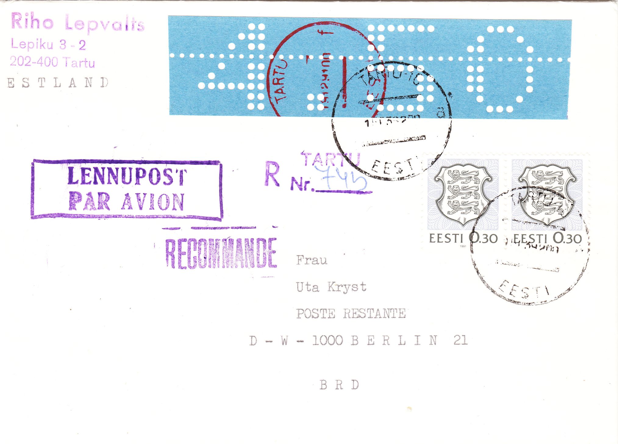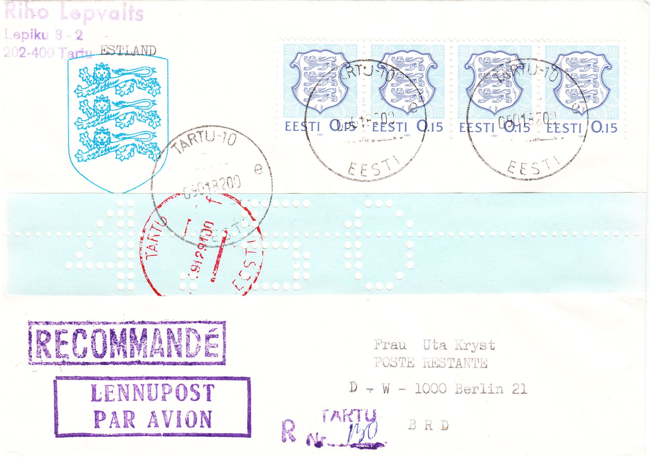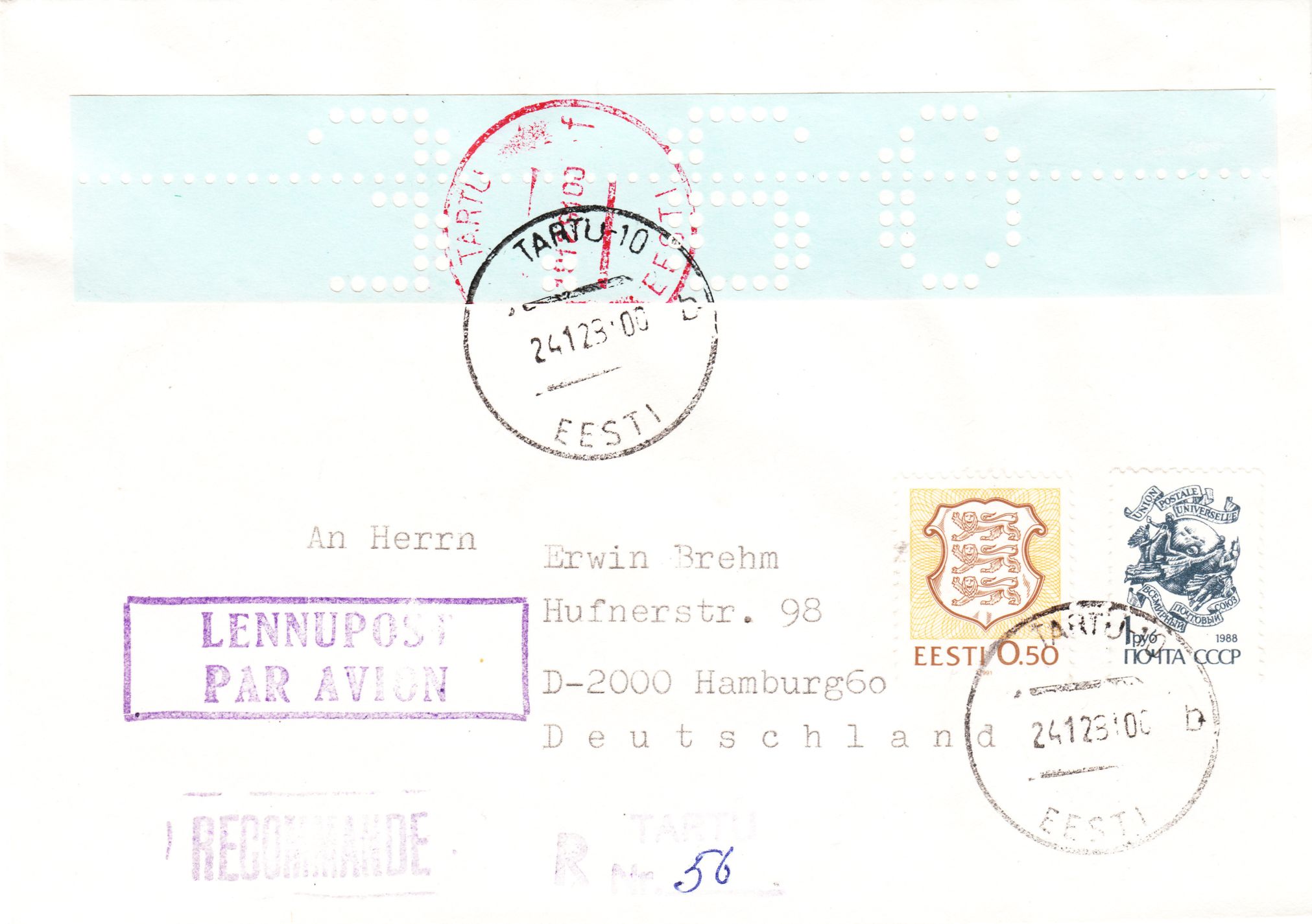 Hier als erster Beleg eine Mischfrankatur der niedrigsten Wertstufe der Lokalausgabe zu 3,60 Rubel in Hellgrünlichblau, MiNr. 1, mit einer Freimarke der UdSSR zu 1 Rubel sowie einer Freimarke aus Estland zu 0,50 Rubel, MiNr. 169, am 24.12.1991 auf Brief nach Deutschland per Einschreiben und Luftpost: