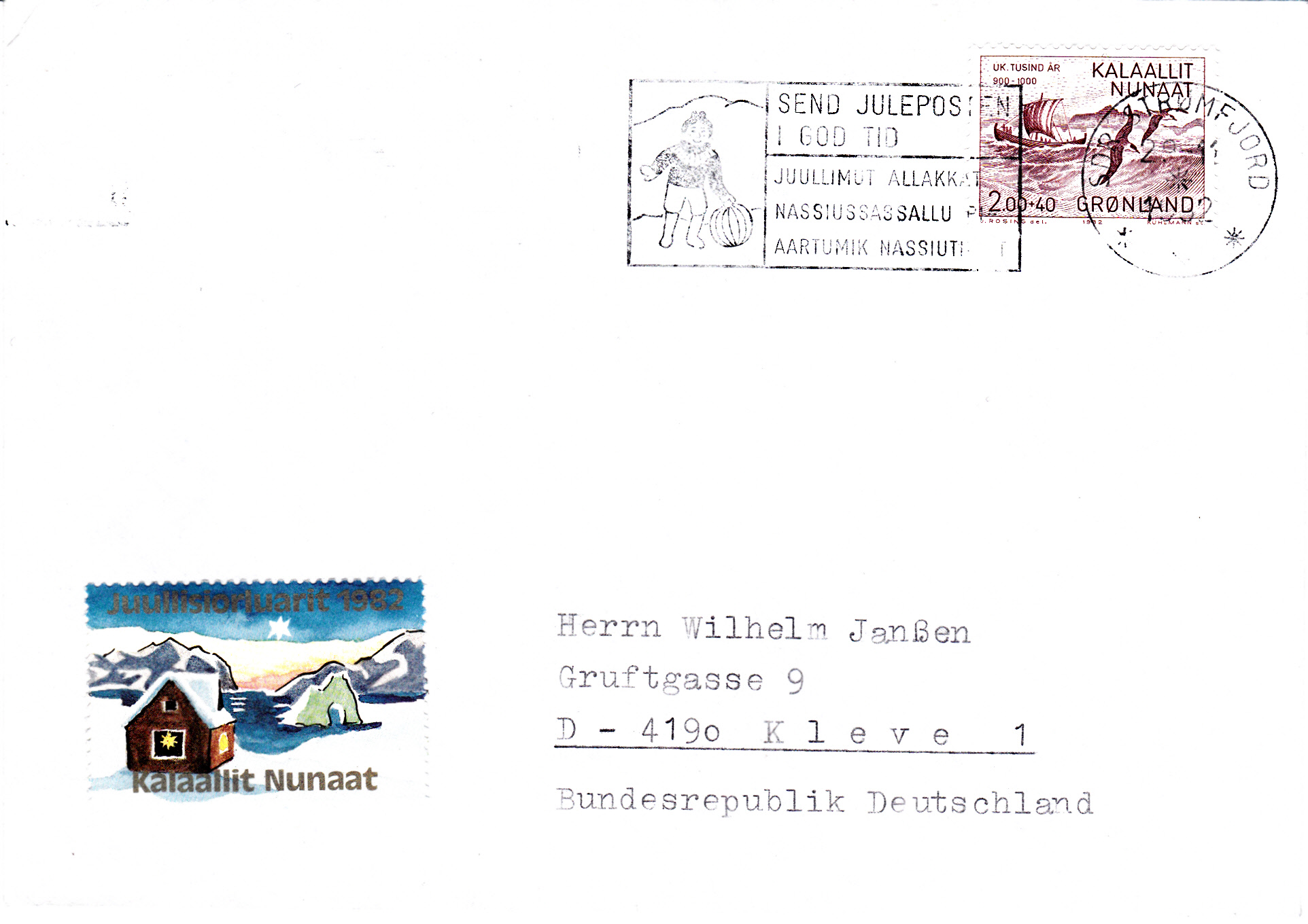 Maschinenwerbestempel vom 29.11.1982 aus Kangerlussuaq (Grönland), auf dänisch Søndre Strømfjord, mit dem Hinweis "Send Juleposten i god tid". Zusätzlich klebt eine Weihnachtsvignette auf dem Umschlag.