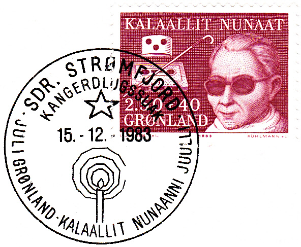 Sonderstempel vom 15.12.1983 aus Kangerlussuaq (Grönland), auf dänisch Søndre Strømfjord, zu "Weihnachten in Grönland (JUL I GRONLAND)". Zusätzlich klebt eine Weihnachtsvignette (Jul-Marke) auf dem Umschlag.