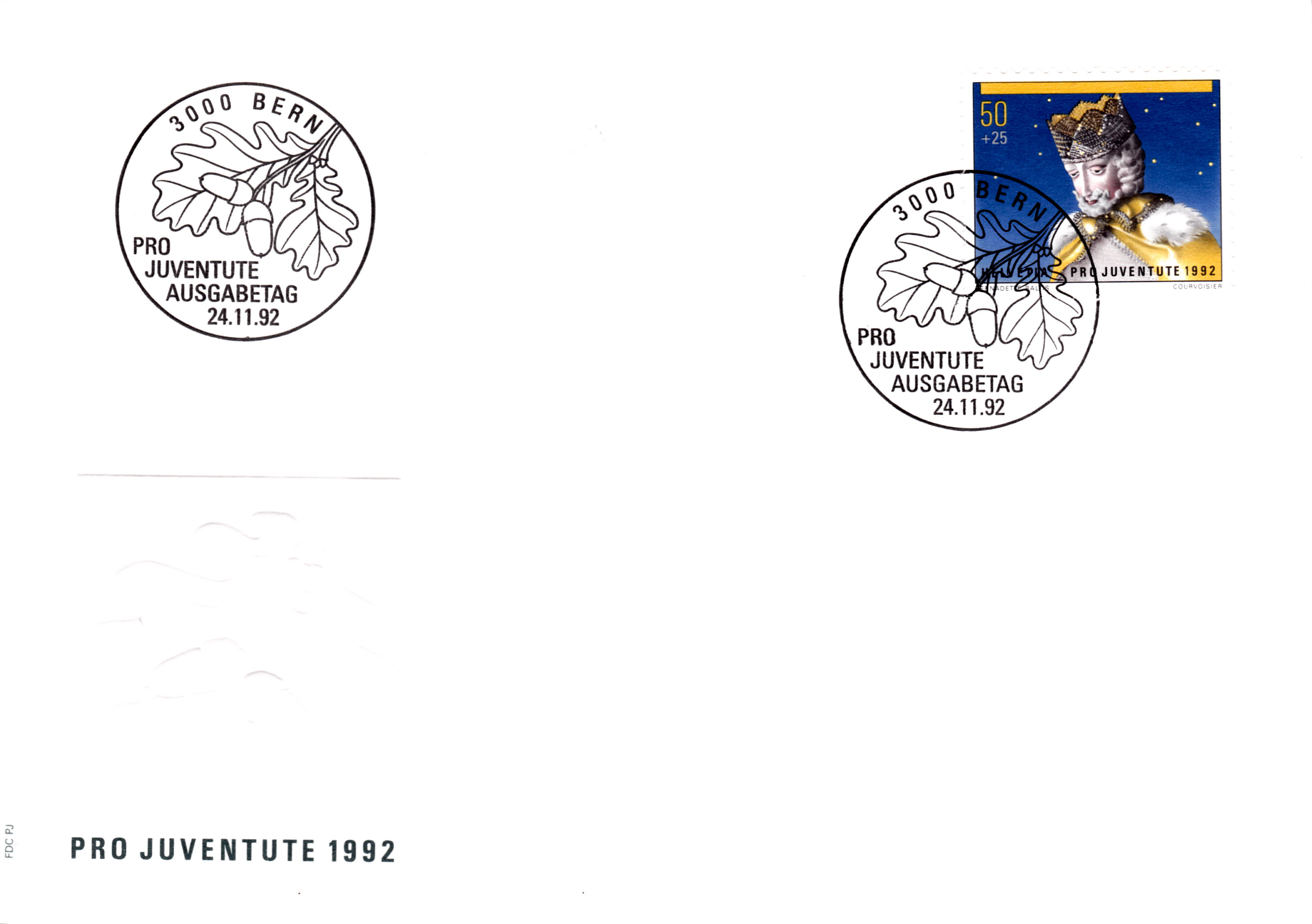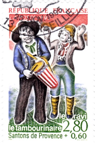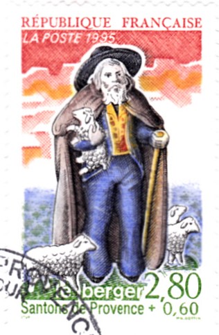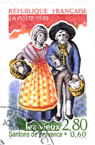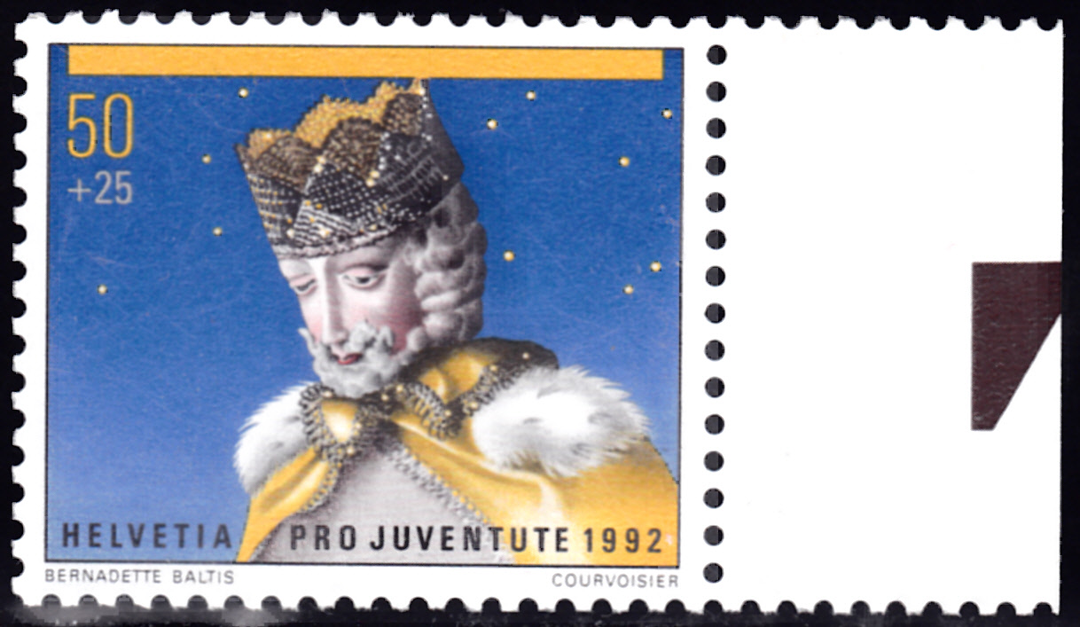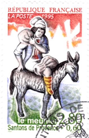 Diese Weihnachtsmarke aus Österreich zeigt Maria und Josef mit dem Jesuskind als geschnitzte Figuren der historischen Goldenen Sams-Krippe aus dem Schlossmuseum Linz.