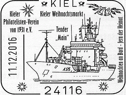 Ein Sonderstempel aus Kiel, der insbesondere der Seeleute gedenkt, die unterwegs von ihren Familien getrennt, Weihnachten an Bord feiern müssen.