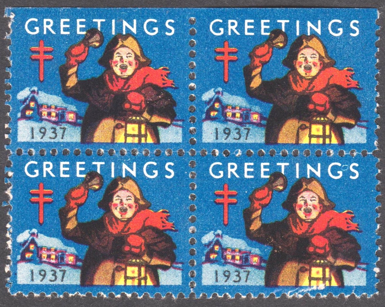 GREETINGS auf Spendenmarke 1937, hier im Viererblock: