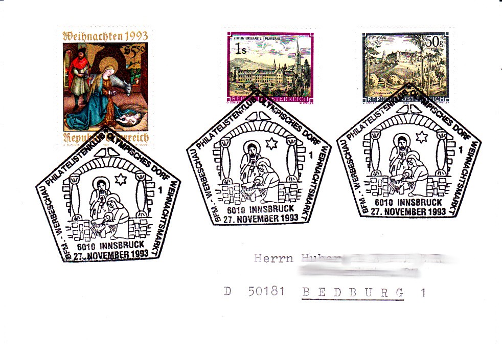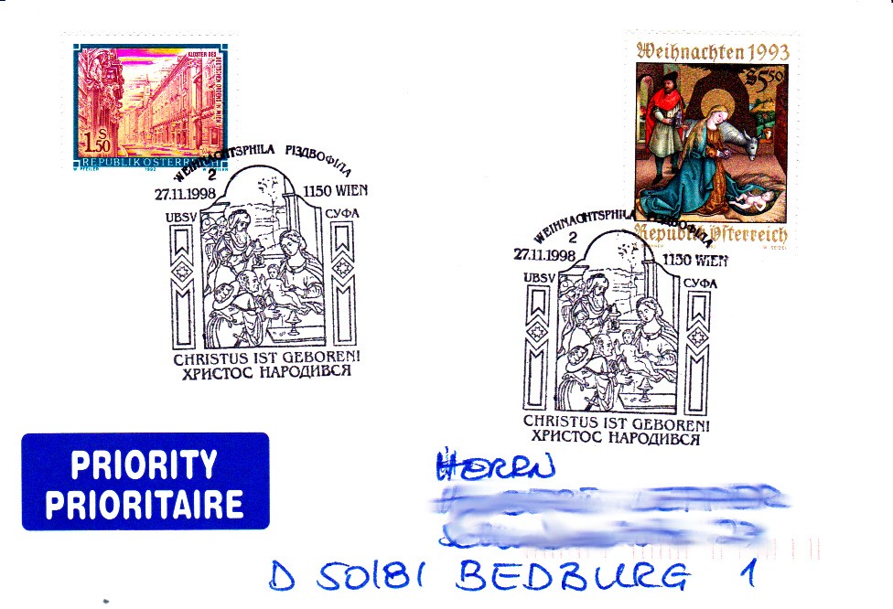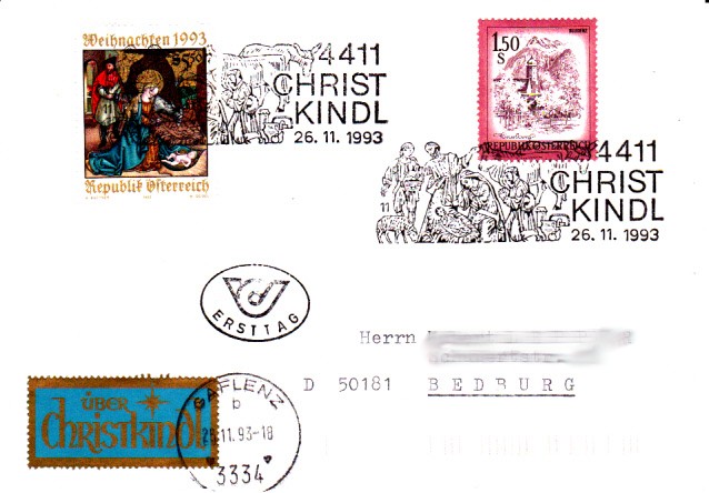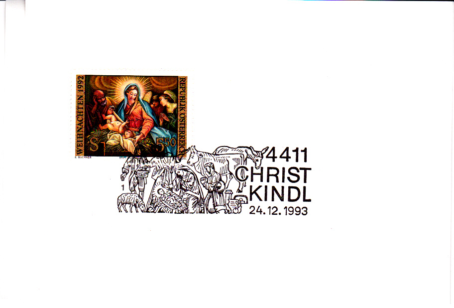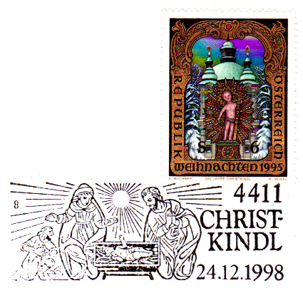 Als erstes zeige ich einen Sonderstempel mit einer Krippe vom Postamt Christkindl vom 27.11.1998. Dies war gleichzeitig der Ersttag der österreichischen Weihnachtsmarke 1998, wie der zusätzliche Stempel Ersttag bestätigt. Es gibt jeweils mehrere Stempelplatten, die mit Zahlen durchnummeriert sind.