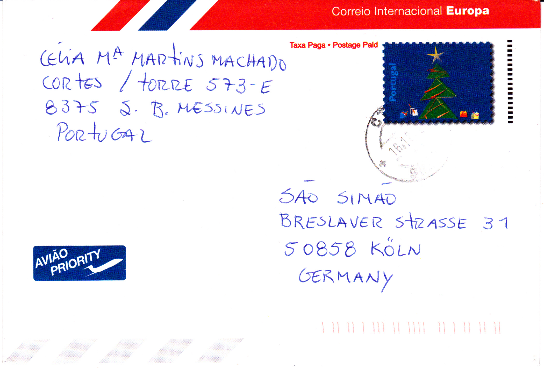 Auf dieser Ganzsache aus Portugal ist im "Markeneindruck" ein Tannenbaum abgebildet. Die Ganzsache ist frankiert für einen Brief innerhalb Europa bis 20 Gramm (rückseitiger Vermerk).
