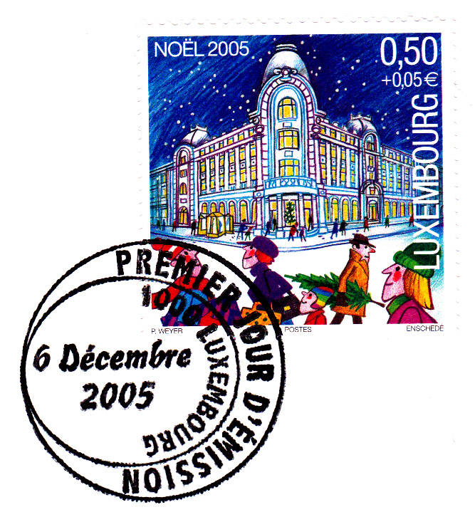 Die Weihnachtsmarke 2005 aus Luxemburg (MiNr 1694) bildet das Vorweihnachtliche Treiben vor dem Hauptpostamt in Esch-sur-Alzette ab. Wenn man genau hinsieht, erkennt man einen Mann, der nach dem Kauf seinen Weihnachtsbaum nach Hause trägt.