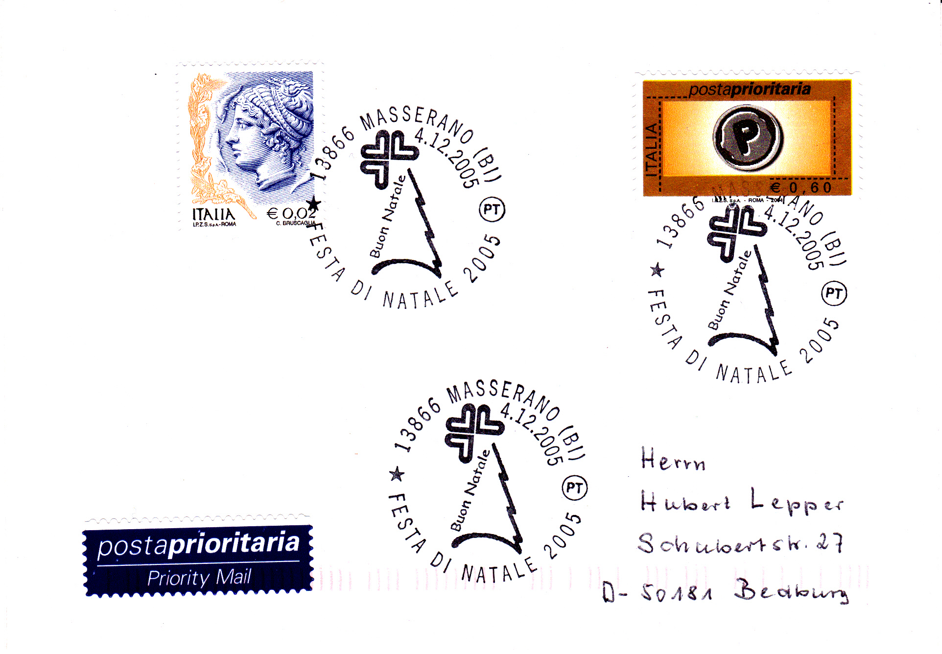 In diesem Sonderstempel aus I-13866 Maserano vom 4.12.2005 ist ein stilisierter Weihnachtsbaum zu erkennen. Der Schriftzug "Buon Natale" wünscht allen "Frohe Weihnachten".