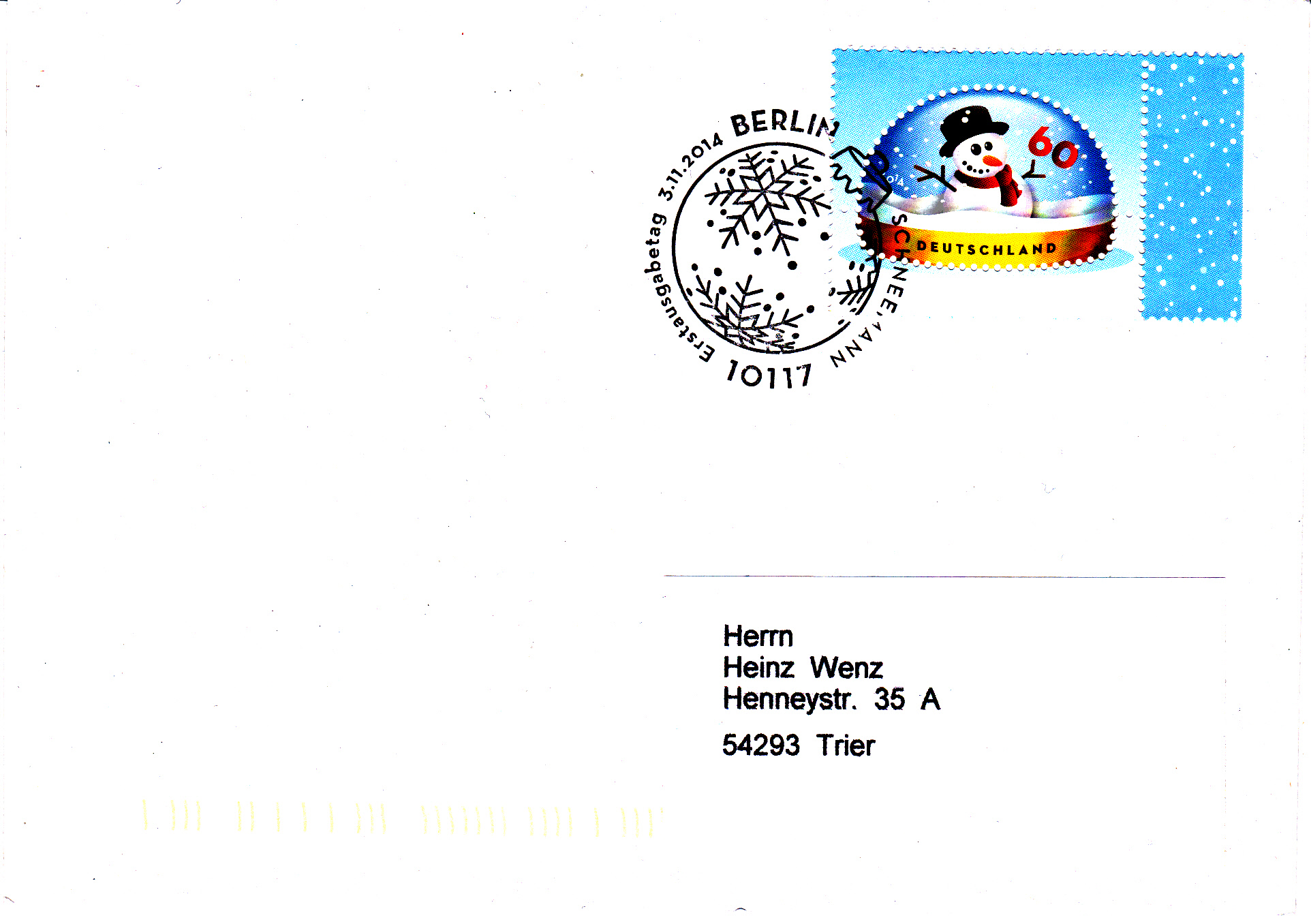Auch im Ersttagssonderstempel Berlin vom 3.11.2014 zur Ausgabe "Schneemann" ist eine Weihnachtskugel zu sehen.