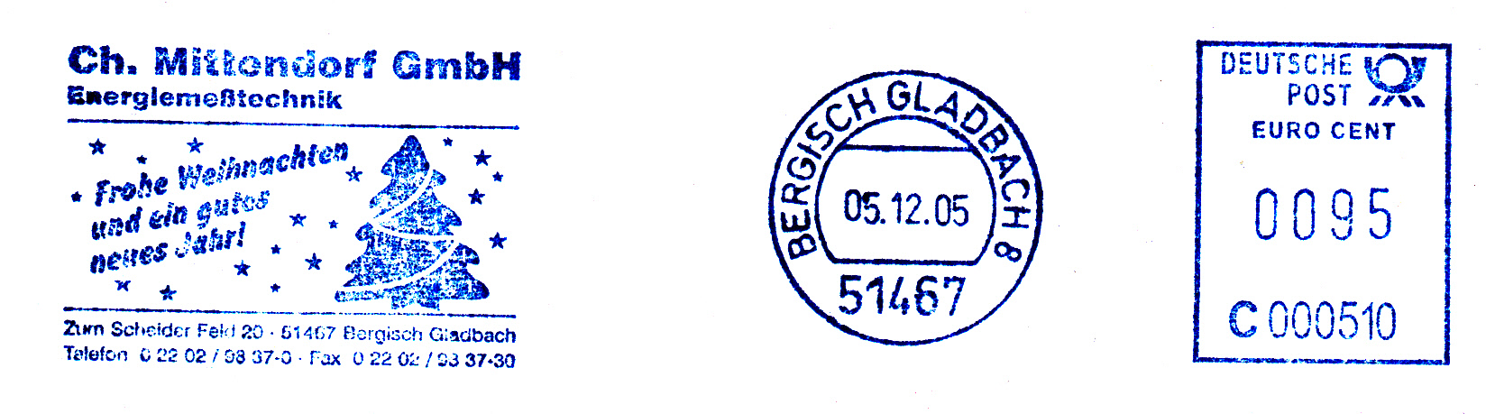 Dieser Frankaturstempel FRANKIT stammt von einer Maschine des Typs "06" mit der Kennung "0004B1" = 1201 der Herstellers "4D" = Pitney Bowes und zeigt einen stilisierten Weihnachtsbaum: