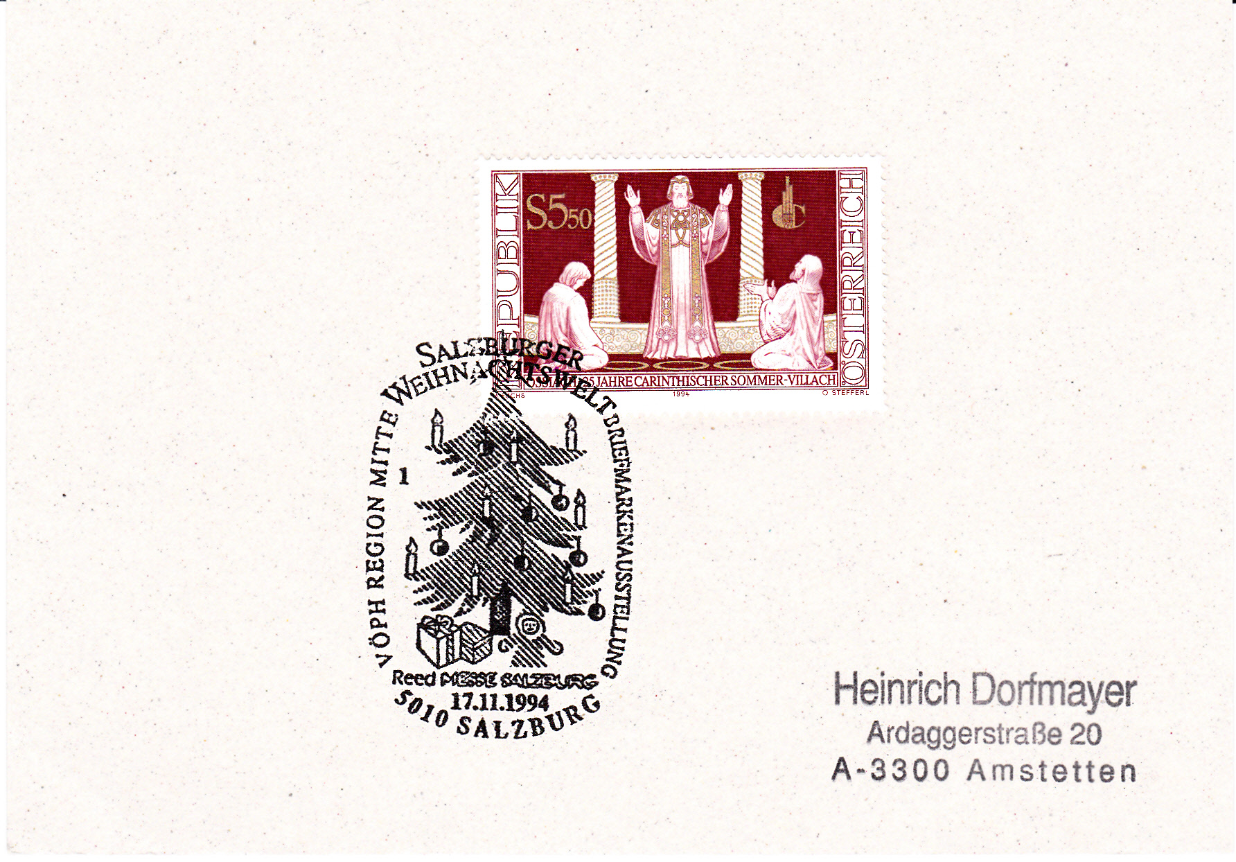 Ein sehr schöner Sonderstempel aus A-5010 Salzburg mit der Abbildung eines geschmückten Weihnachtsbaumes mit Geschenken unter dem Baum.