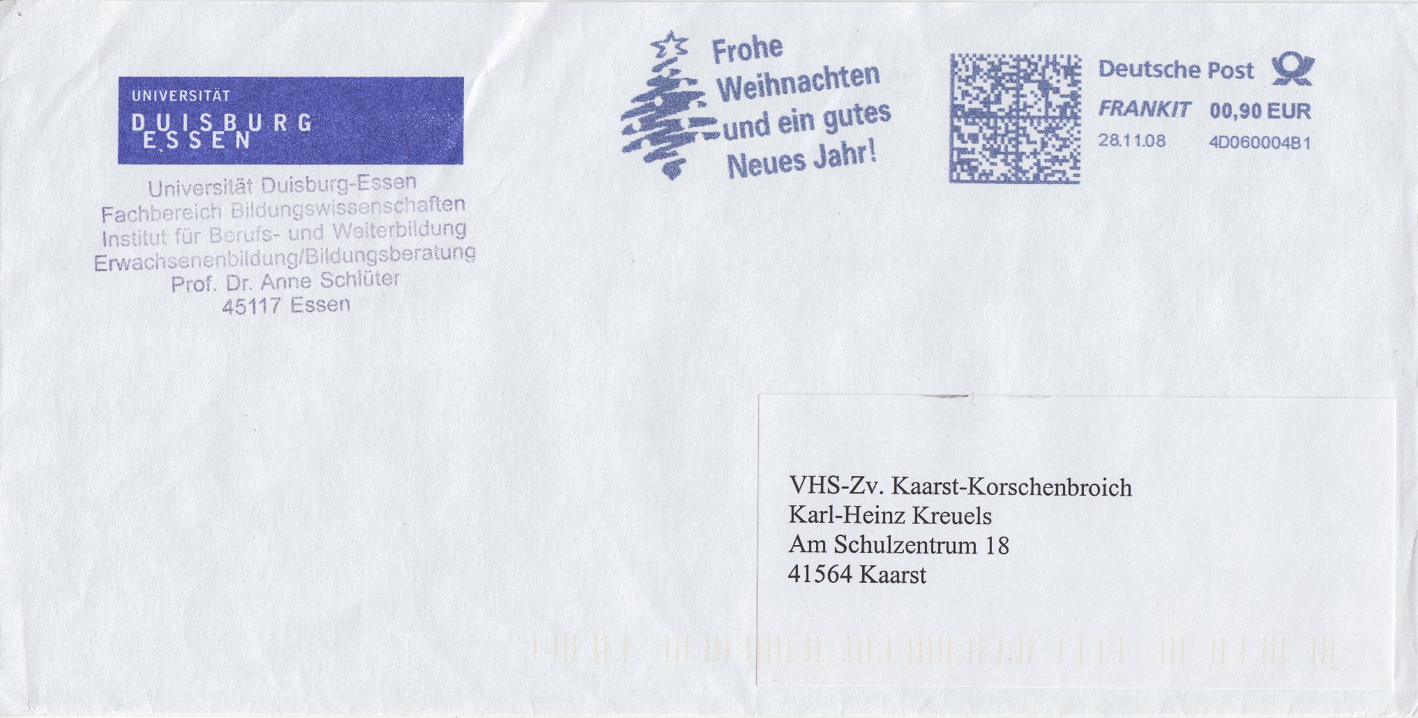 Briefumschlag mit Frankierlabel vom 19.12.2005 der Stadtwerke Düsseldorf , die ihre Post vom "West Mail Zustelldienst" befördern ließ. Im Label sind Weihnachtswünsche zu lesen und ein Weinachtsbaum als Illustration zu sehen.