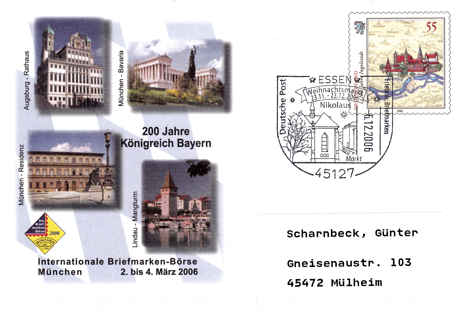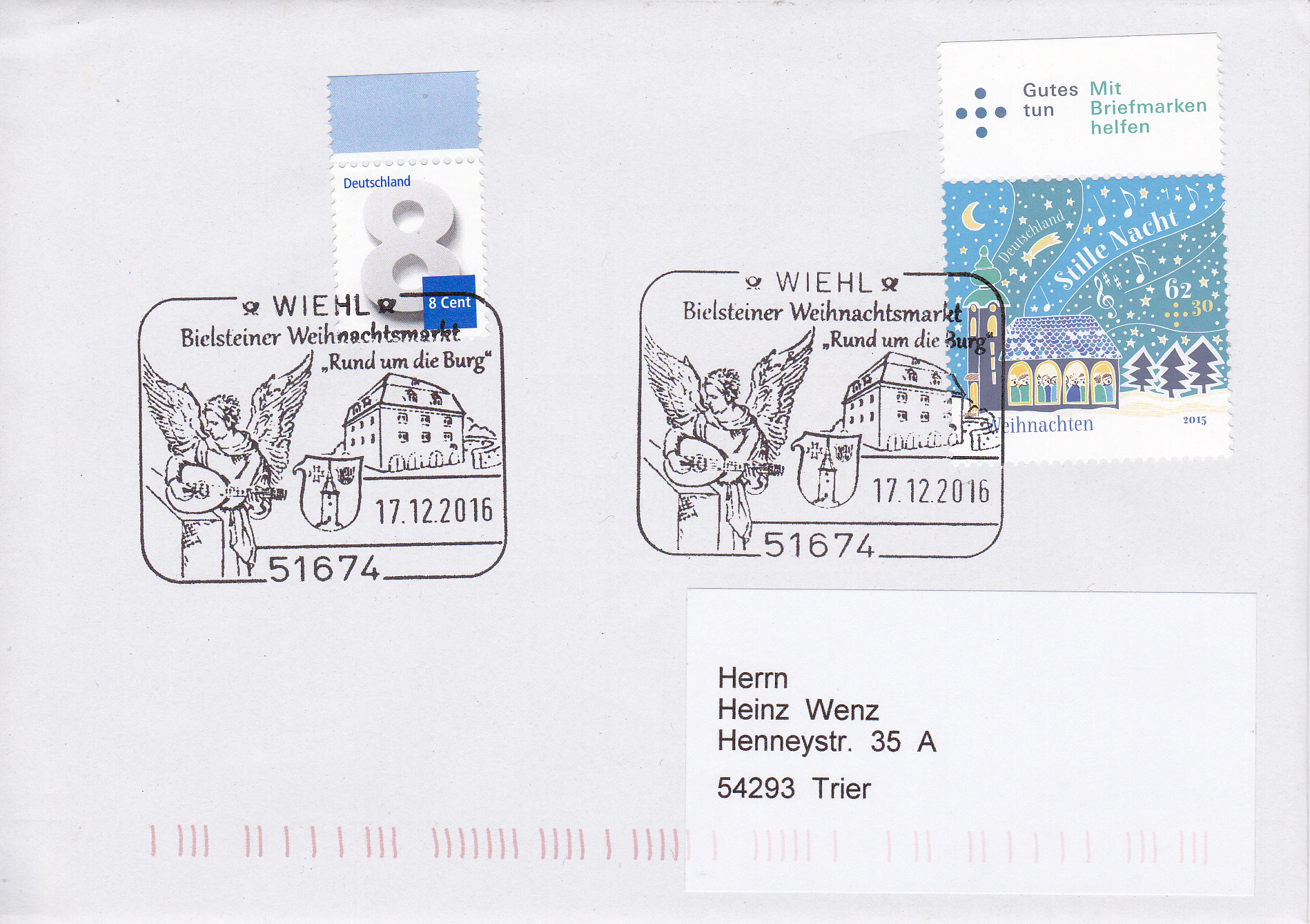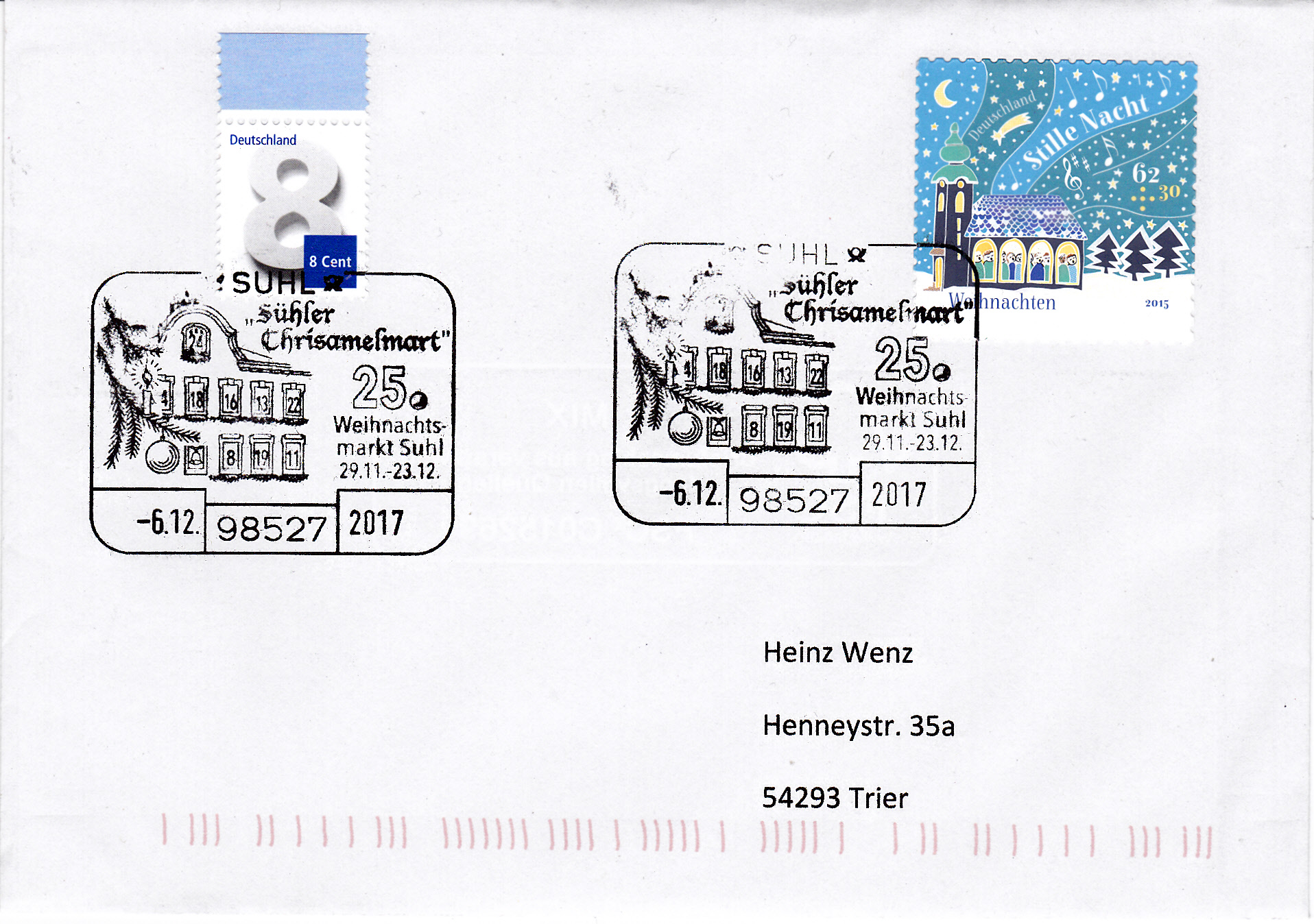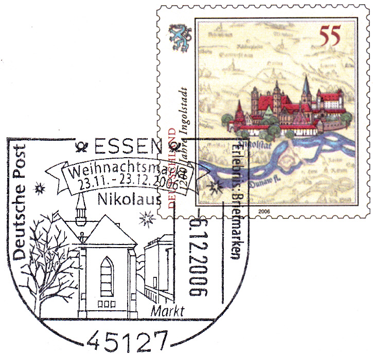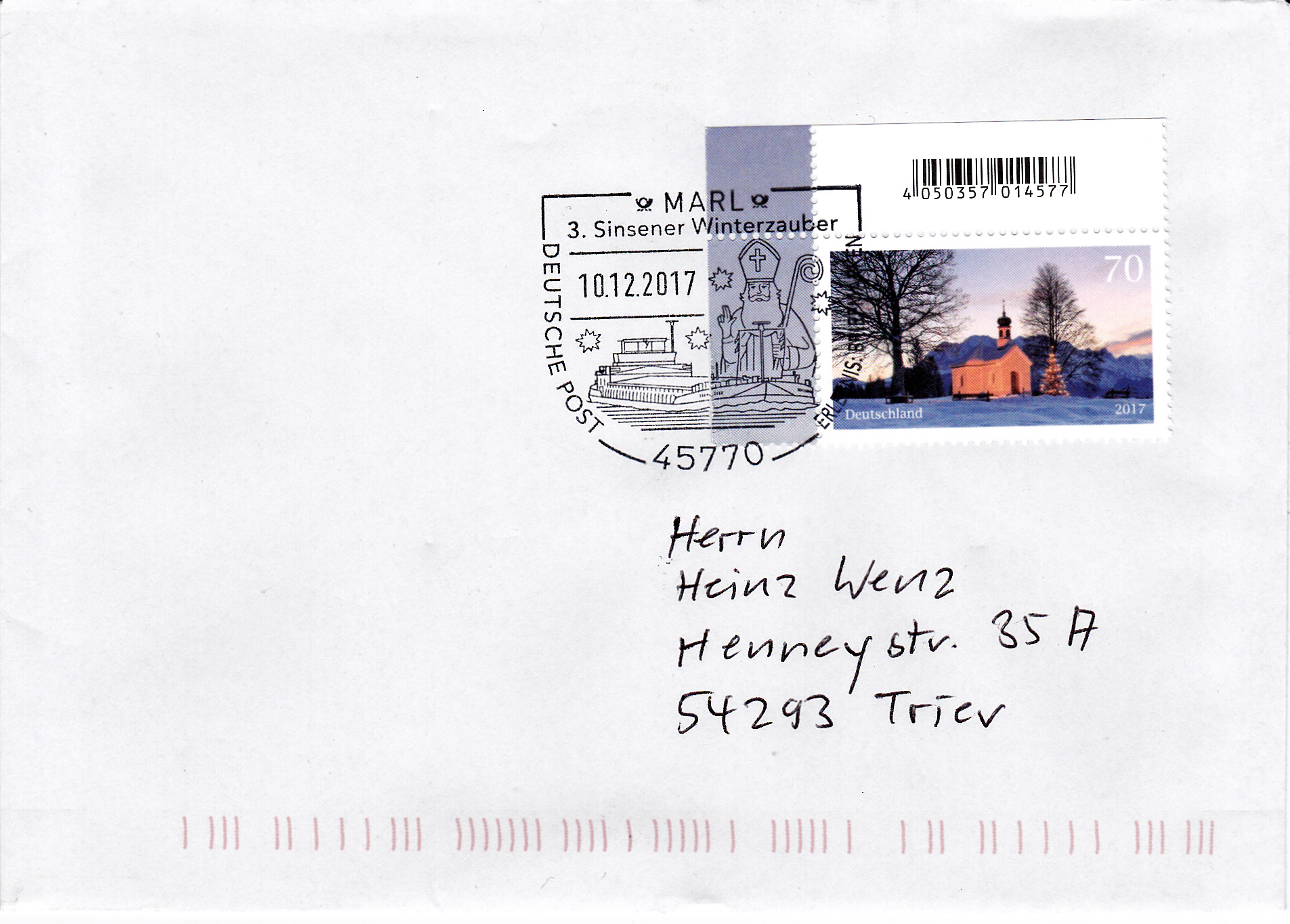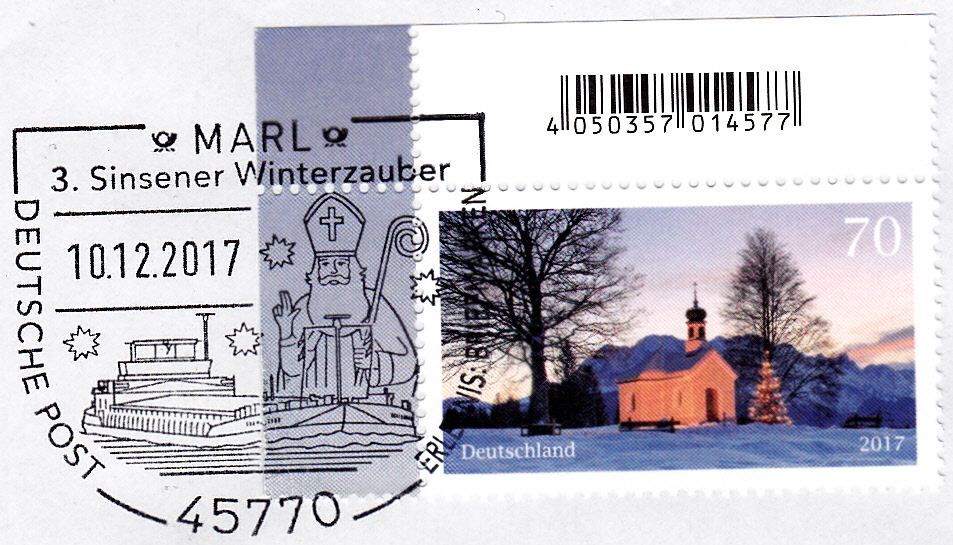 Sonderstempel zum 3- Sinsener Adventszauber am 10.12.2017. Im Stempelbild werden ein Binnenschiff auf dem Wesel-Datteln-Kanal und St. Nikolaus, der Schutzpatron der Seeleute, gezeigt.