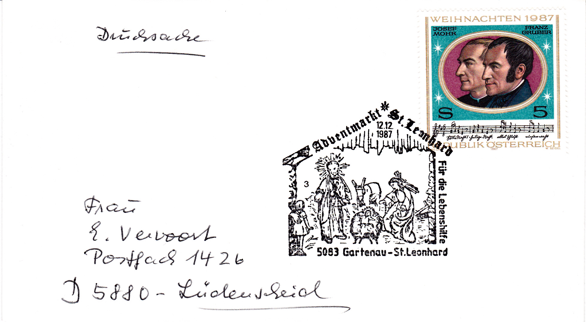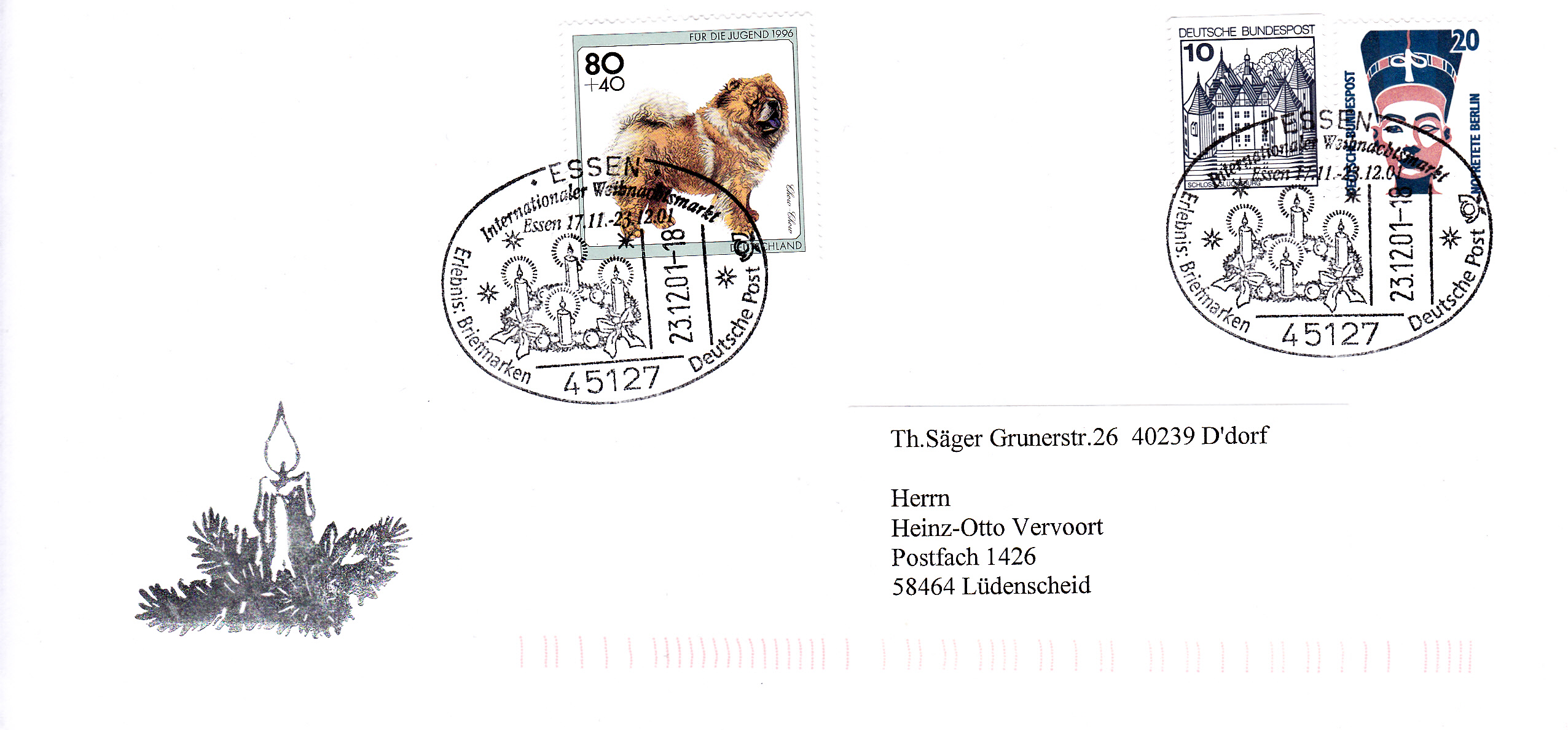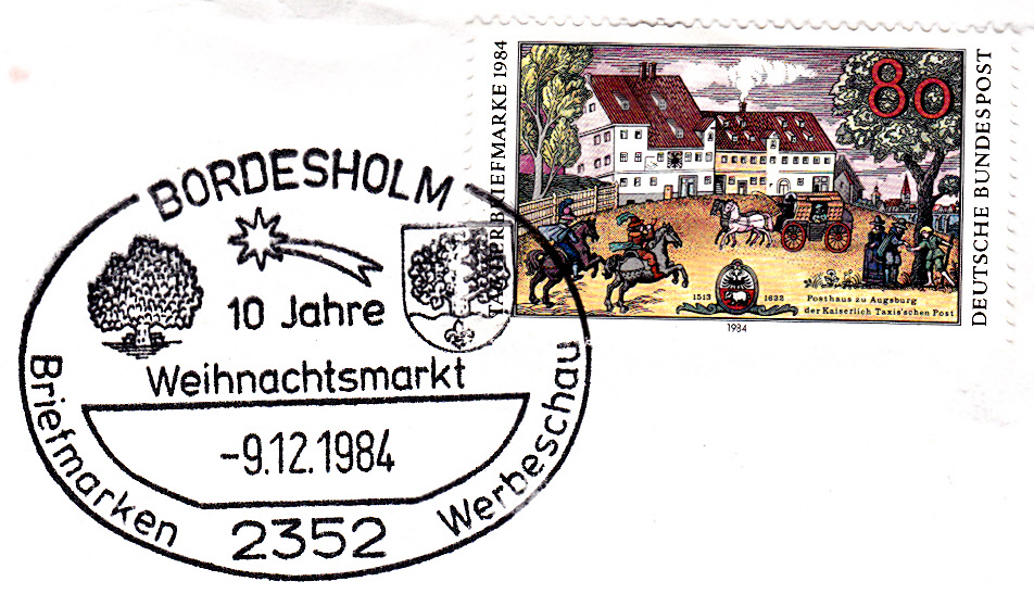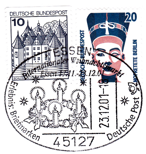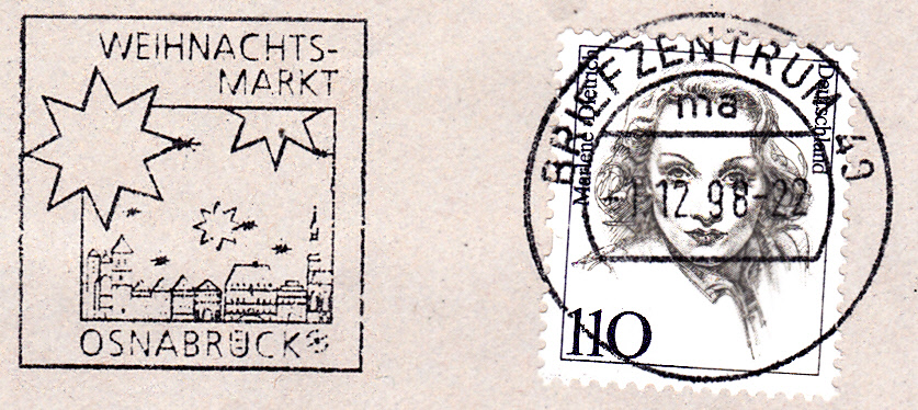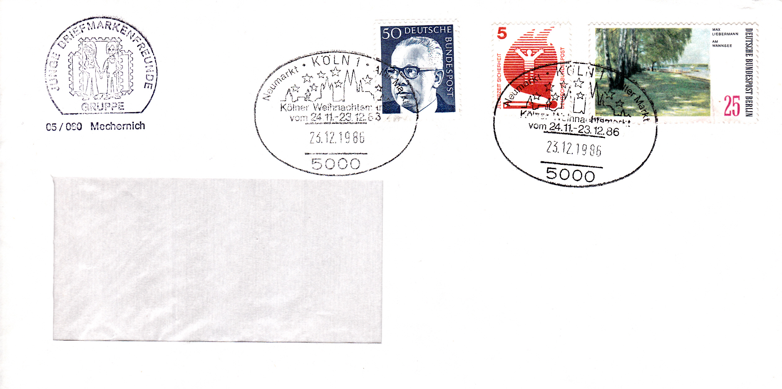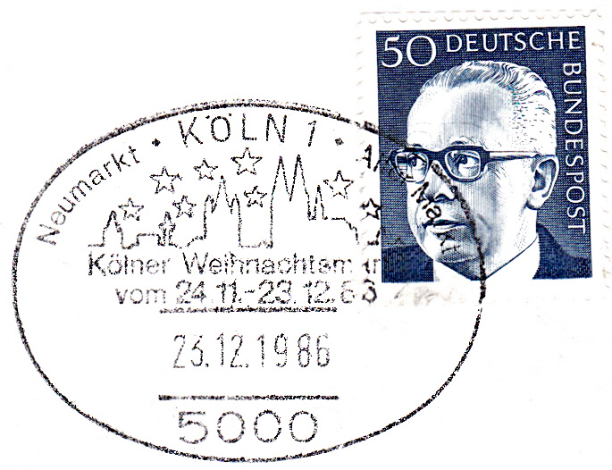 Auch in Köln wurde über mehrere Jahre immer wieder das gleich Motiv im Sonderstempel zum Weihnachtsmarkt ´verwendet. Hier ein Stempel vom 23.12.1986 der das gleiche Motiv hat wie der von Rüdiger bereits gezeigte Stempel aus dem Jahre 1994.