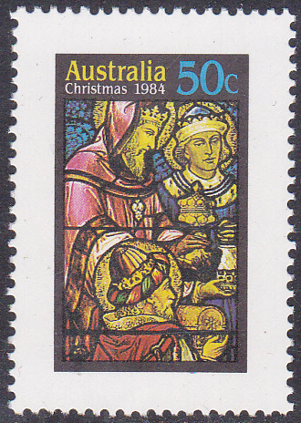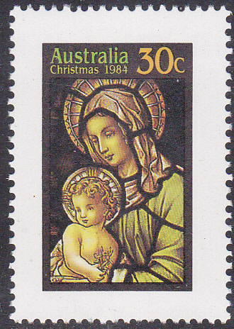 Auf den Weihnachtsmarken des Jahres 1984 werden Buntglasfenster aus australischen Kirchen abgebildet. Hier die Marke zu 24 Cent (MiNr 895) mit einem Engel mit Kind.