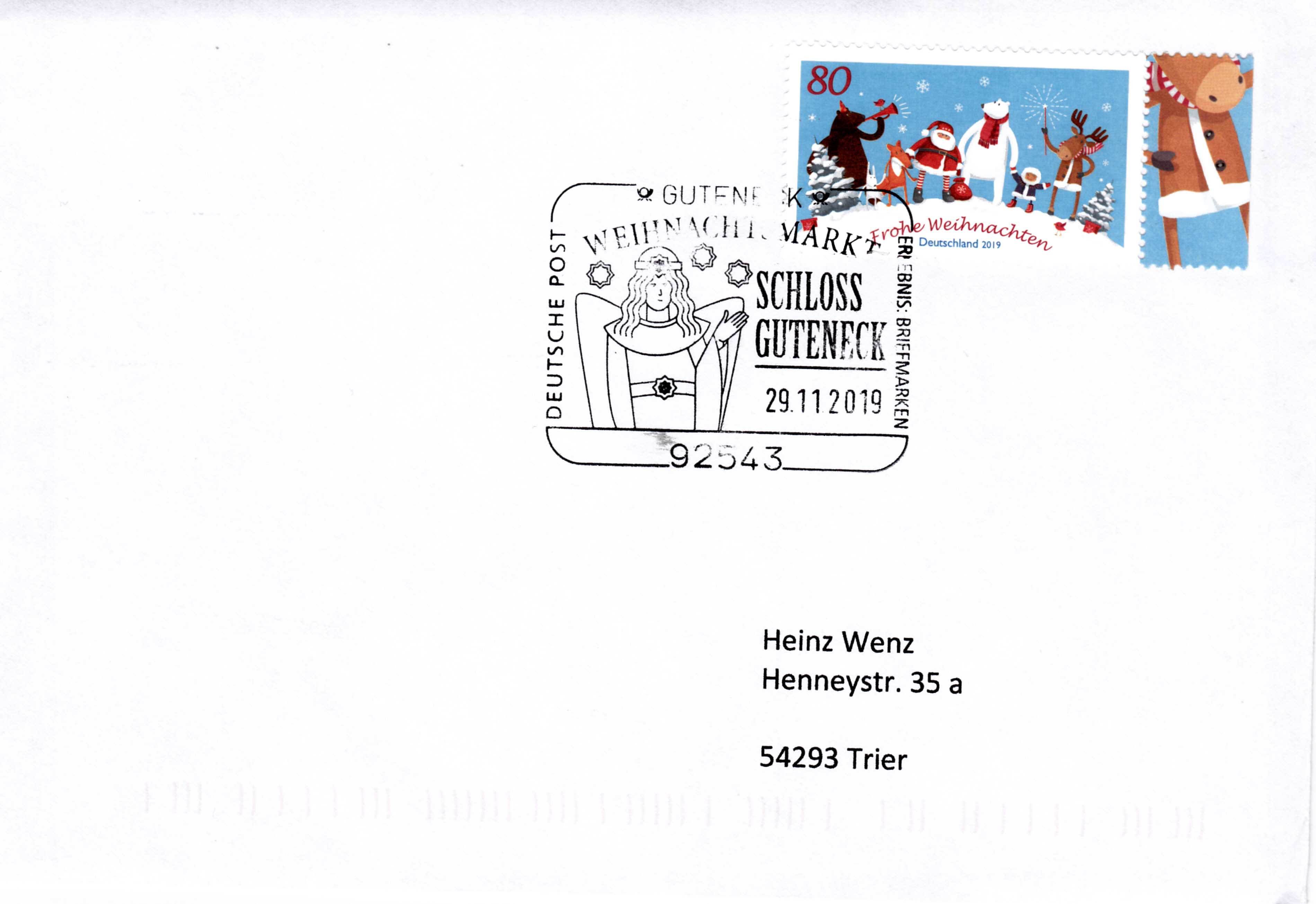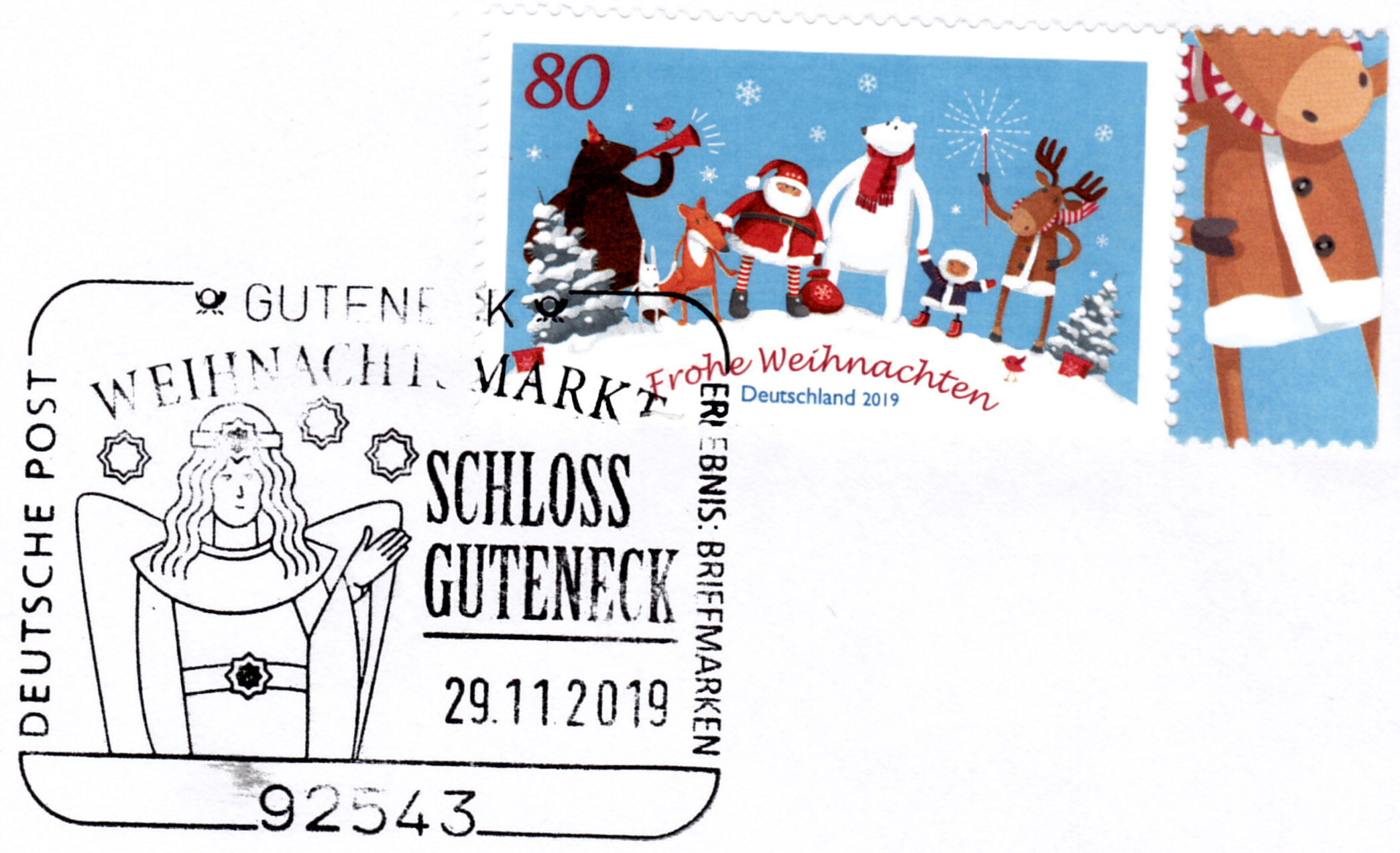 Der Sonderstempel vom 29.11.2019 zum Weihnachtsmarkt Schloss Guteneck wird das Christkind gezeigt.