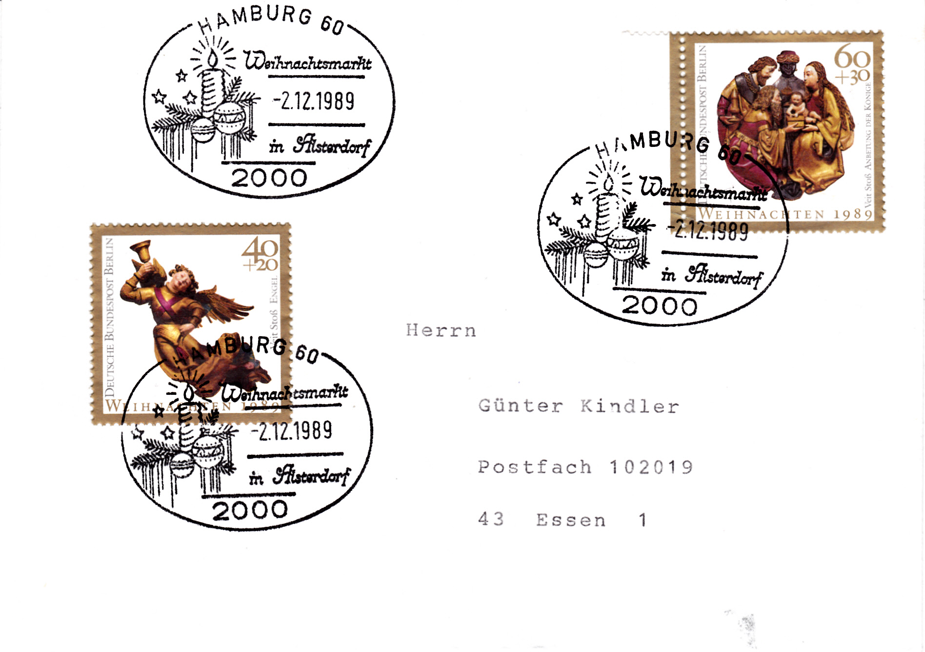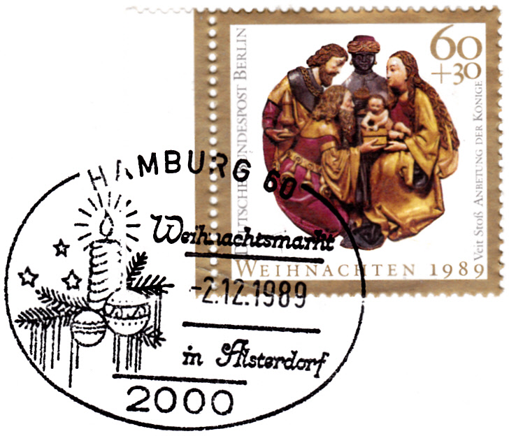 In Hamburg wurde zum Weihnachtsmarkt 1989 in Alsterdorf am 2.12.1989 dieser Sonderstempel mit einem Tannenzweig mit Christbaumschmuck und Kerze verwendet.