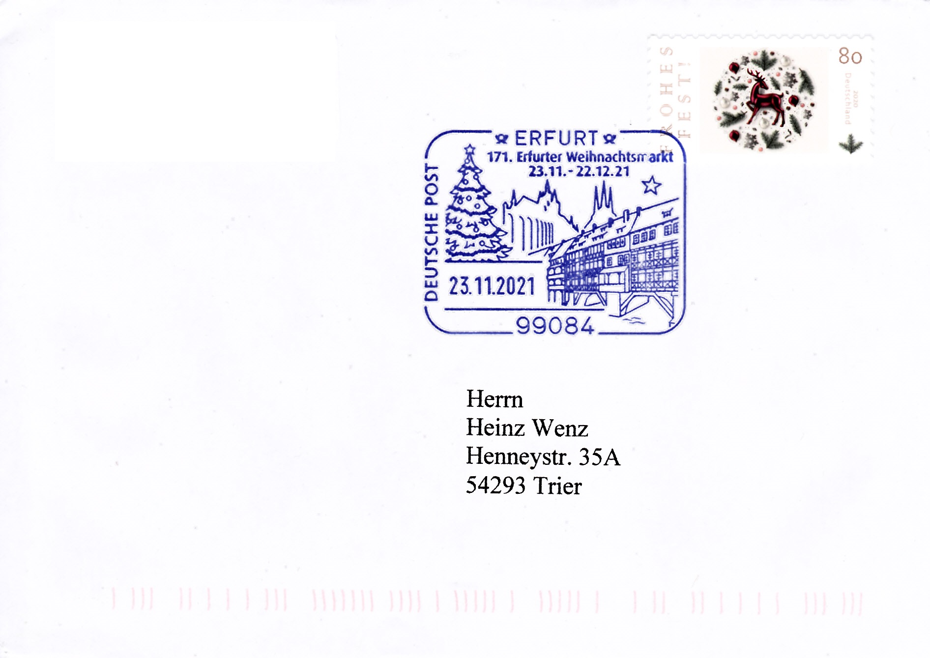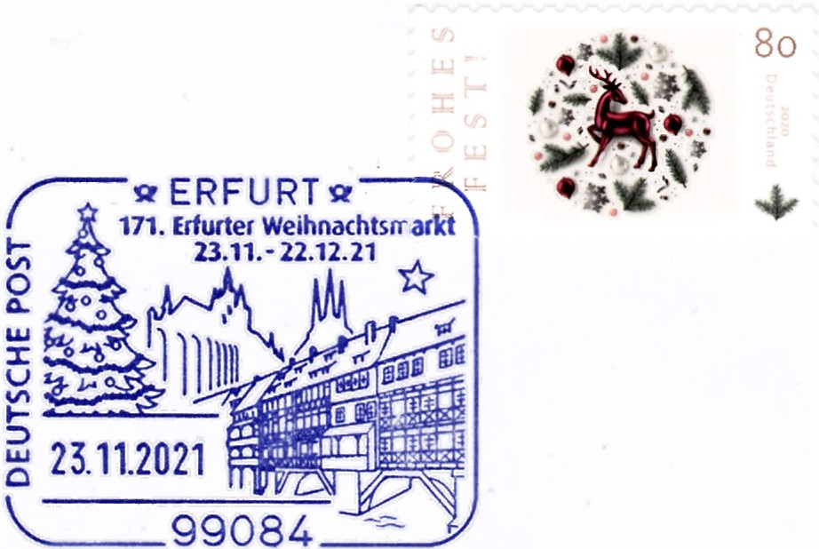 Sonderstempel vom 23.11.2021 aus Erfurt zum Weihnachtsmarkt 2021 in Erfurt.