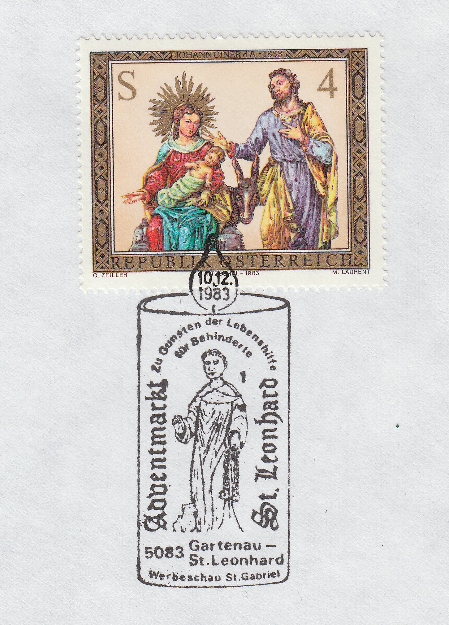 In 5083 Gartenau - St. Leonhard fand am 10.12.1983 ein Adventmarkt zu Gunsten der Lebenshilfe für Behinderte statt, was mit diesem Sonderstempel in Form einer brennenden Kerze dokumentiert wurde: