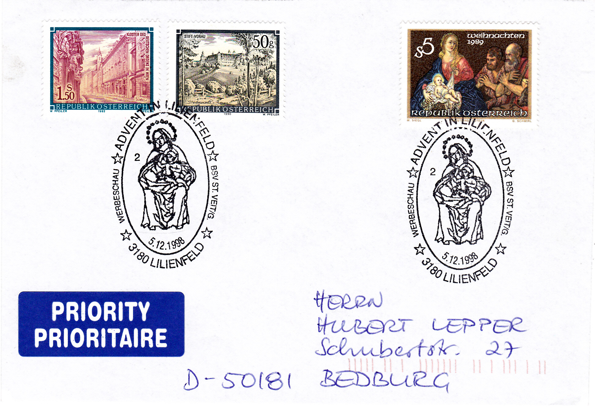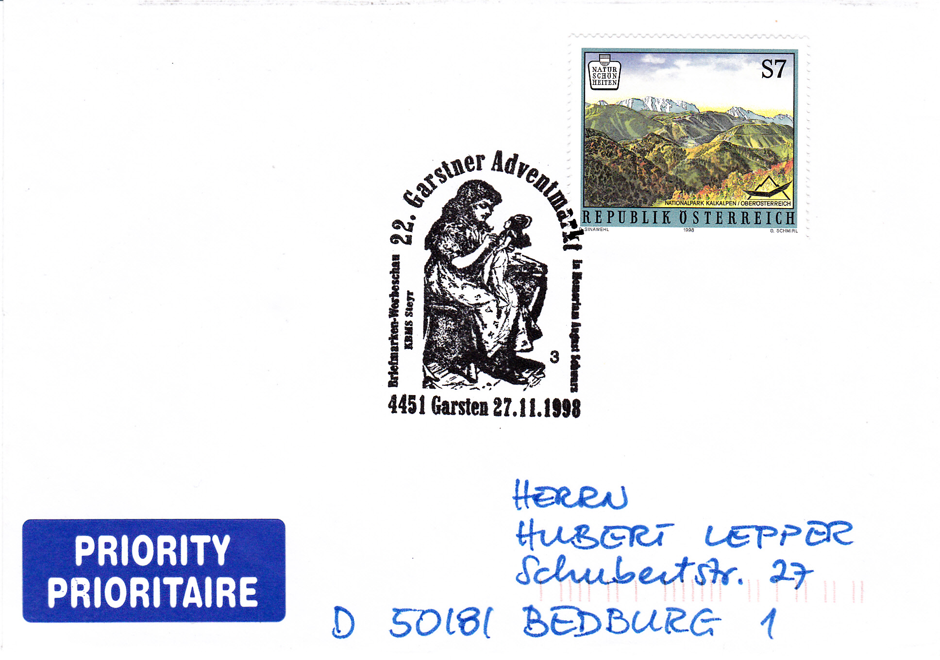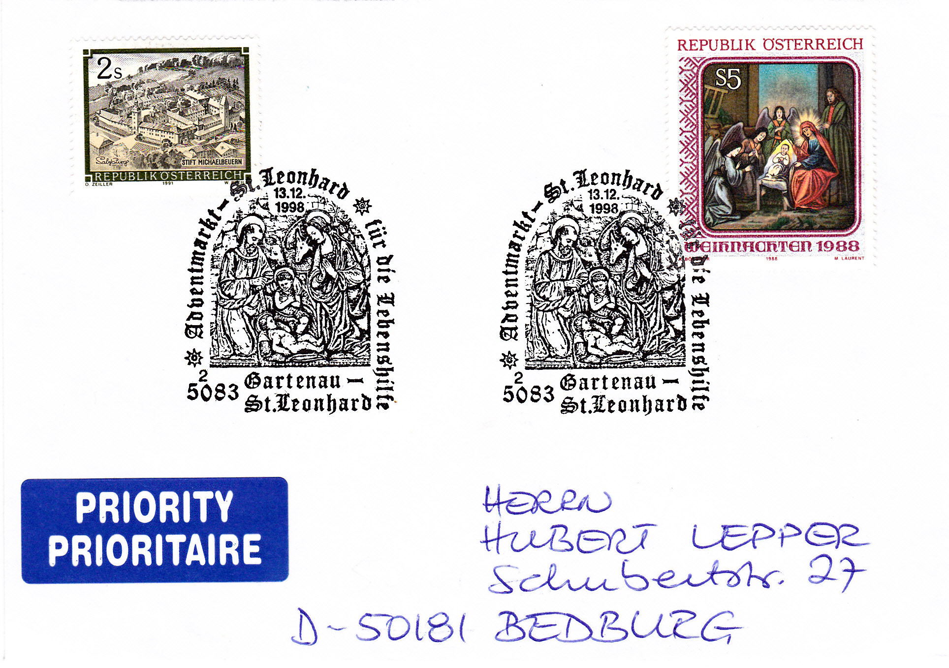 Dieser Brief wurde mit der Sonderpostbeförderung bei der Adventsfahrt am 27.11.1968 von Salzburg nach Oberndorf befördert und mit dem Sonderstempel "10 Jahre Sonderpostämter Adventfahrten" mit der Kennziffer abgestempelt.