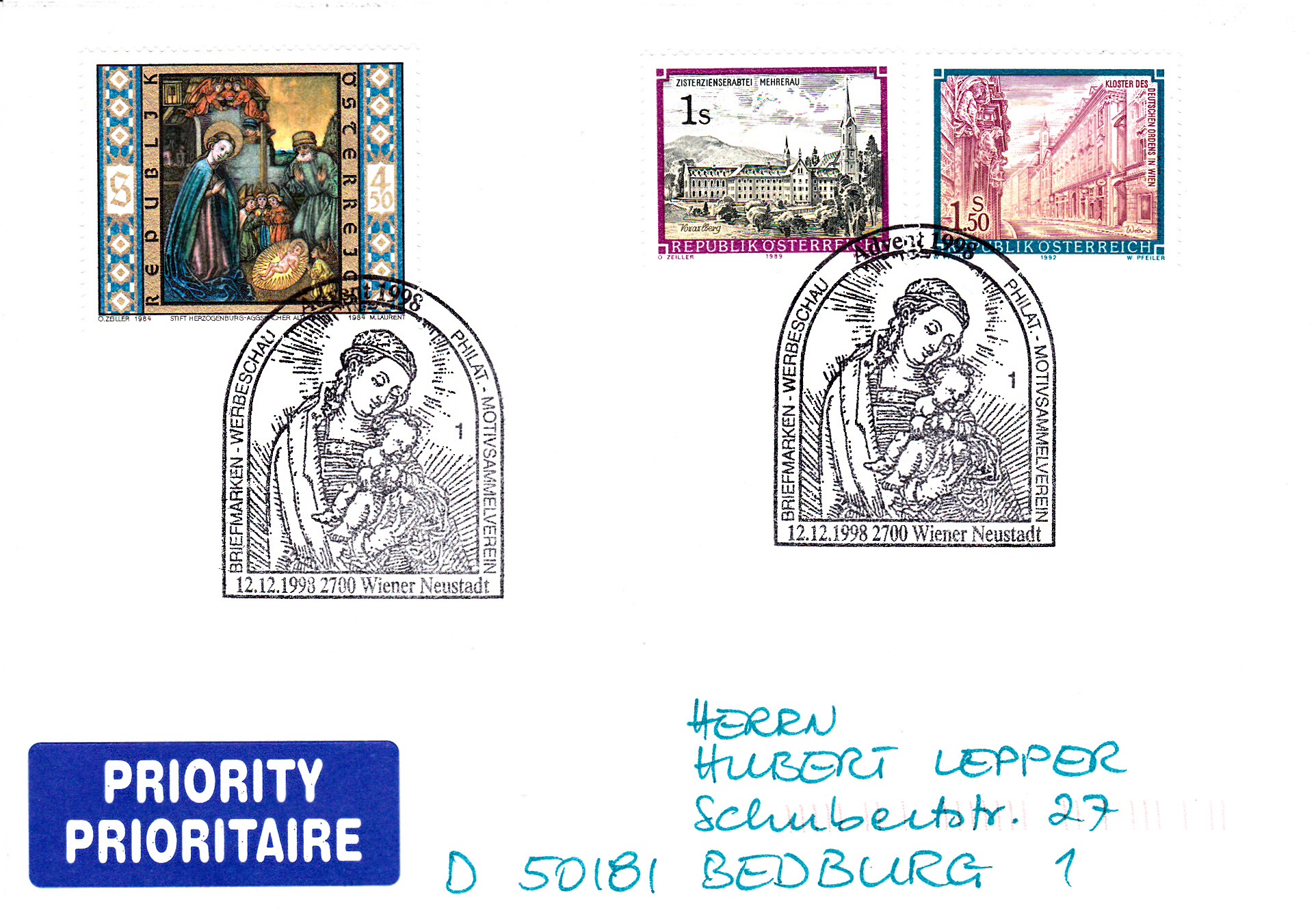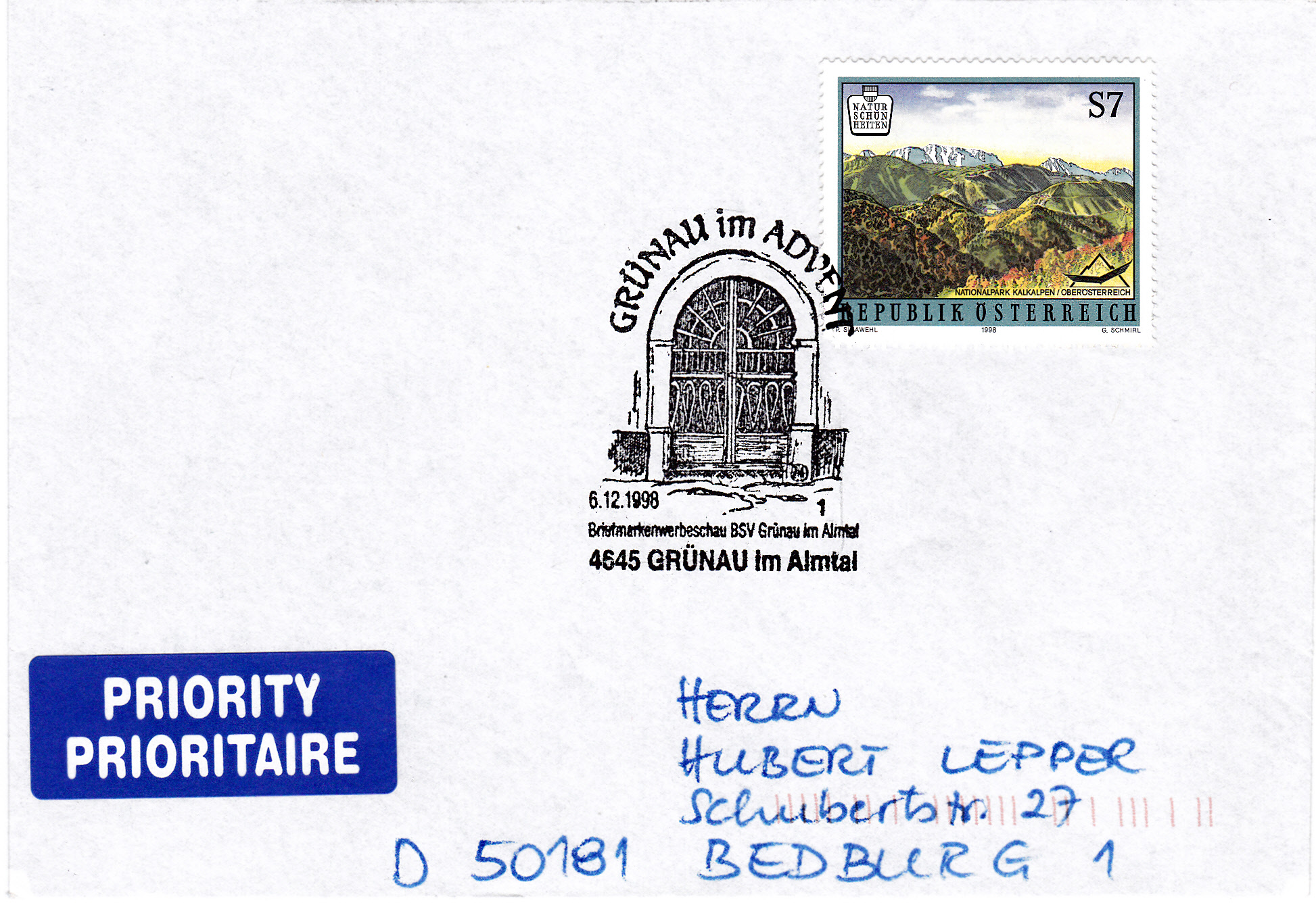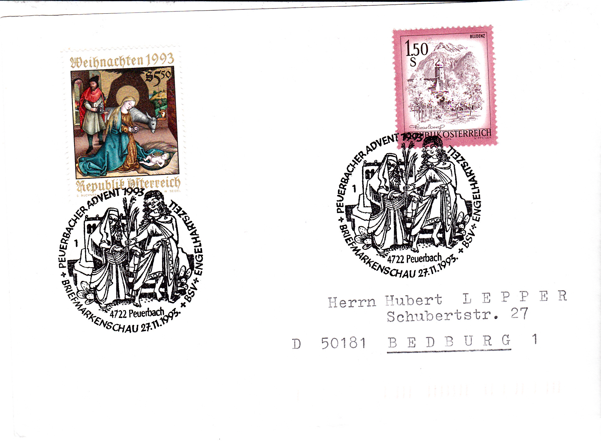 Dieser Brief wurde mit der Sonderpostbeförderung bei der Adventsfahrt am 27.11.1968 von Salzburg nach Oberndorf befördert und mit dem Sonderstempel "10 Jahre Sonderpostämter Adventfahrten" mit der Kennziffer abgestempelt.