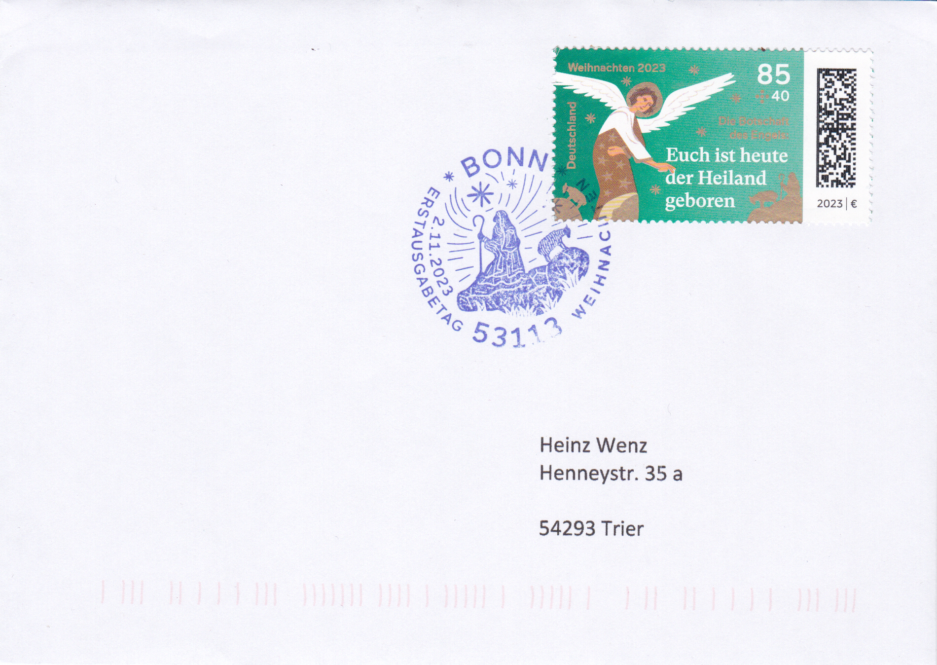 Die Weihnachtsmarke 2023 der Deutschen Post (MiNr 3793) zum Thema "Botschaft des Engels" zeigt die Abbildung "Euch ist heute der Heiland geboren" (Verkündigung an die Hirten) nach einer Miniatur im Perikopenbuch Heinrichs II., entstanden zwischen 1007 und 1012 im Kloster Reichenau.