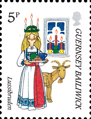 Bei den Weihnachtsmarken 1985 wurde in Guernsey auch eine Marke (MiNr 341) mit dem Motiv "Lichtbraut" Lucia gestaltet.