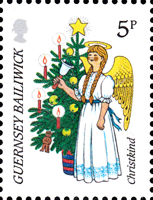 Diese Marke aus der Weihnachtsserie aus Guernsey (MiNr 346) zeigt eine Darstellung des Christkindes vor einem Weihnachtsbaum.