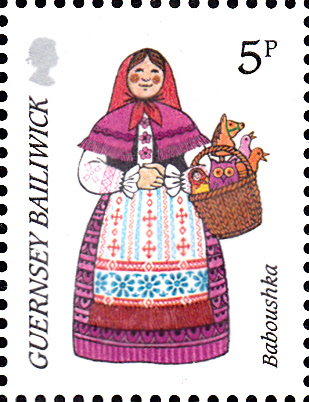 Auf dieser Marke aus Guernsey (MiNr 350) wird Babuschka mit einem Geschenkekorb abgebildet.