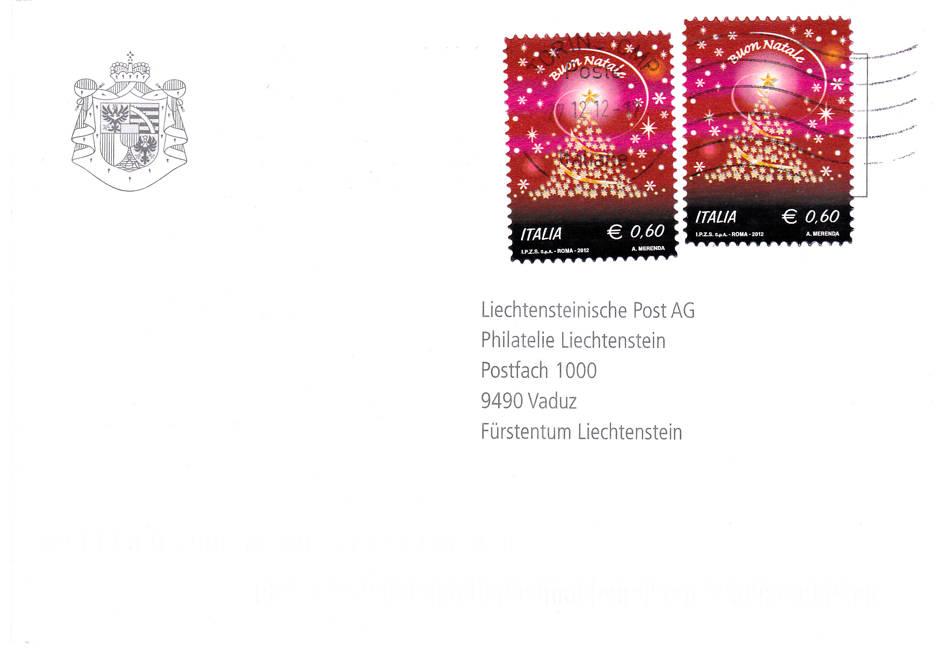 Zwei Marken einer Weihnachtsmarke aus dem Jahre 2012 aus Italien (MiNr 3566) dienten hier als Ftankatur eines Briefes von Turin nach Liechtenstein.