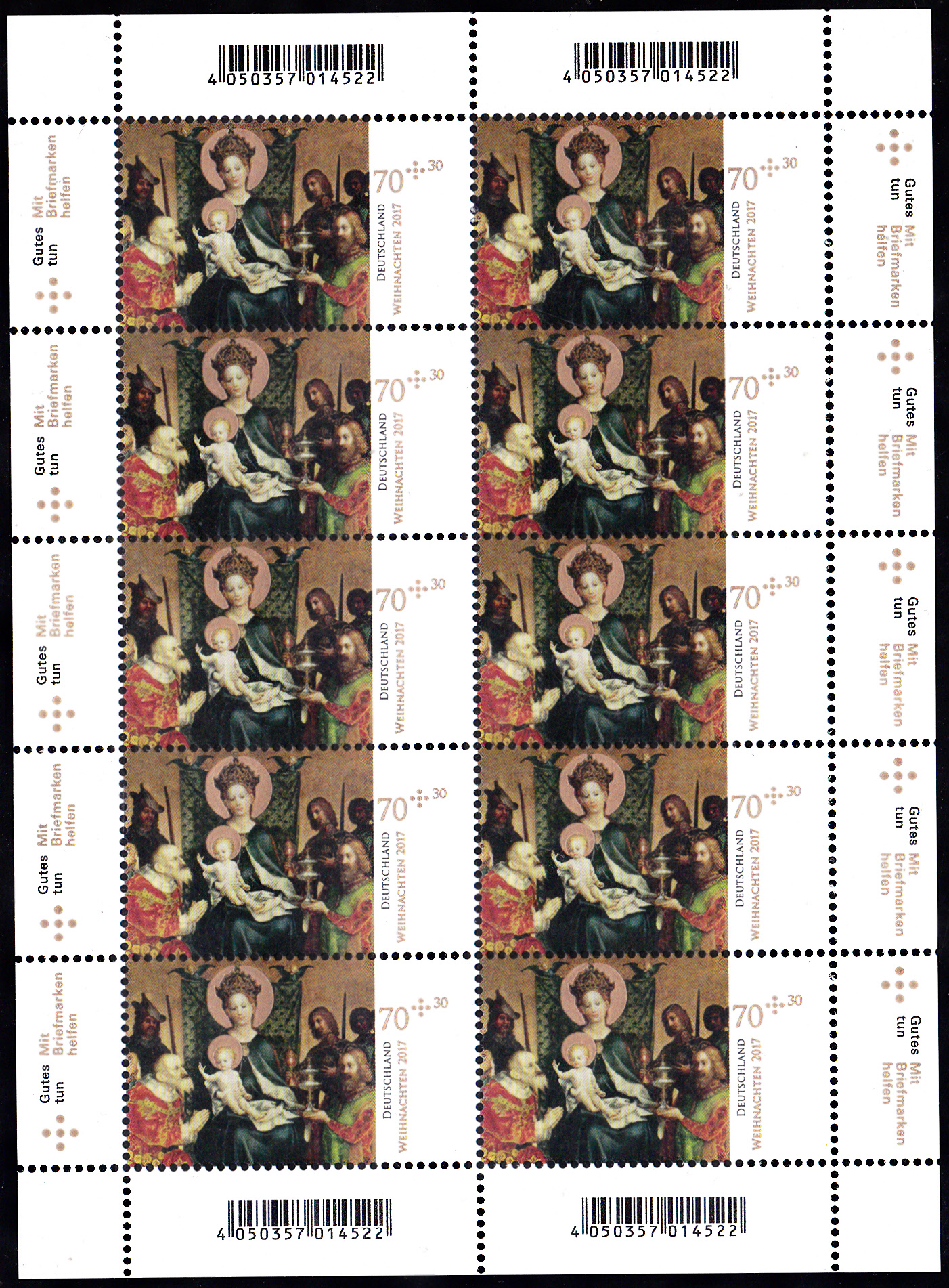 Die Weihnachtsmarke 2017 der Deutschen Post (MiNr 3340) zeigt die "Anbetung der Heiligen Drei Könige" nach dem Altargemälde von Stefan Lochner (1400/10-1451) im Kölner Dom.