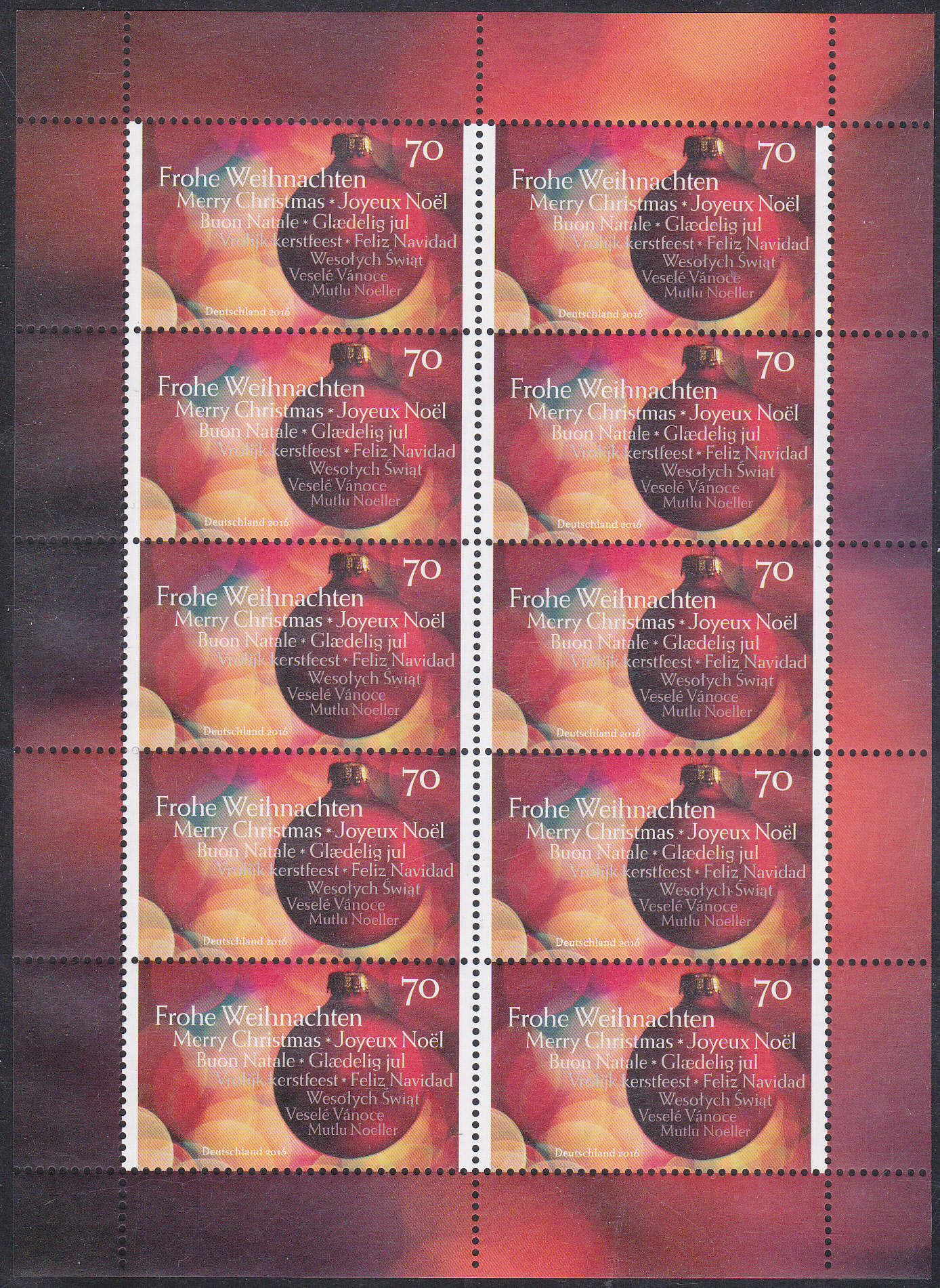 Bei der Deutschen Post AG ist diese Marke (MiNr 3269) mit der Abbildung einer Christbaumkugel und Weihnachtsgrüße in verschiedenen Sprachen.