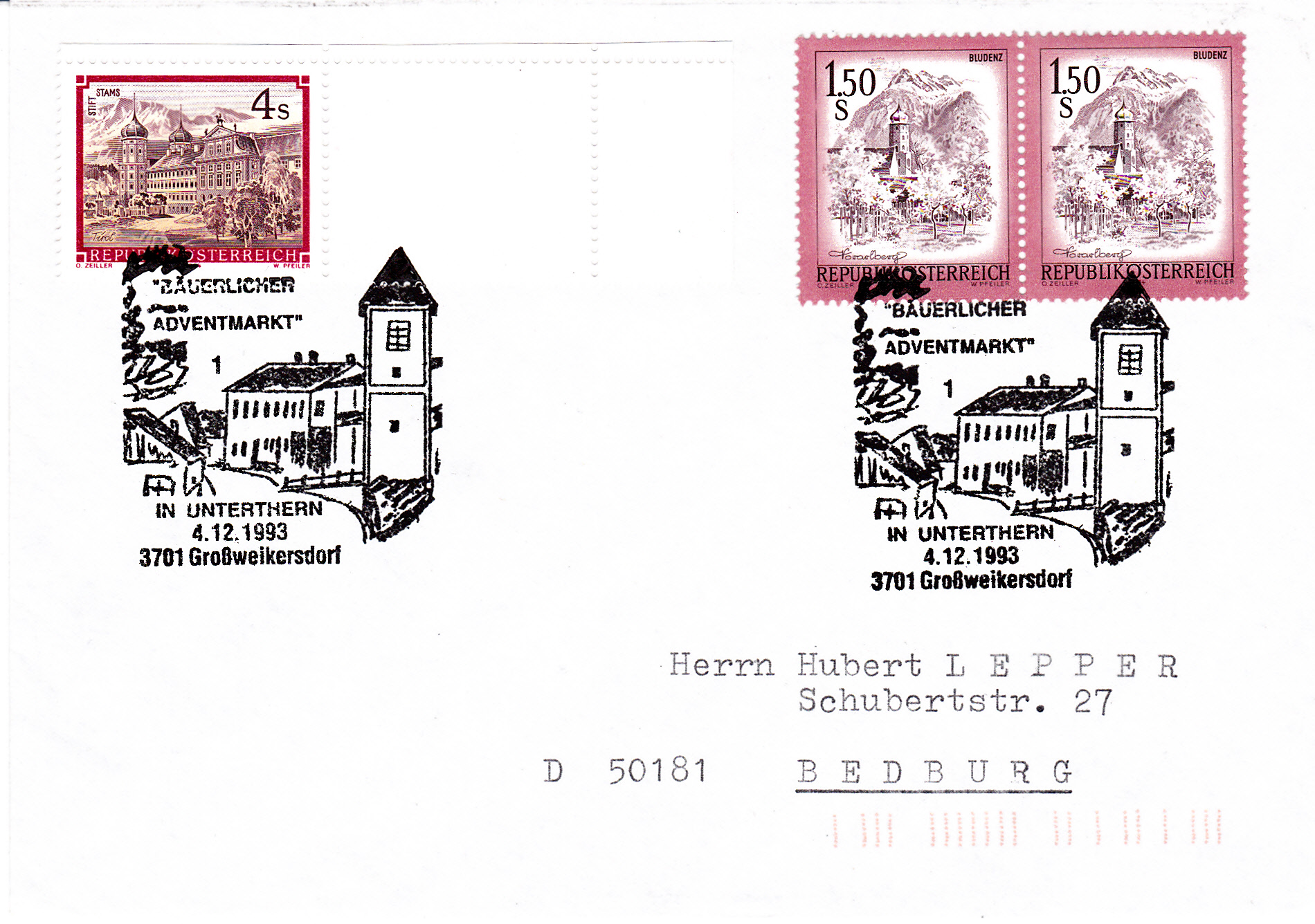 Sonderstempel aus Großweikersdorf vom 4.12.1993zum "Bäuerlichen Adventmarkt" in Unterthern mit der Kennziffer "1".
