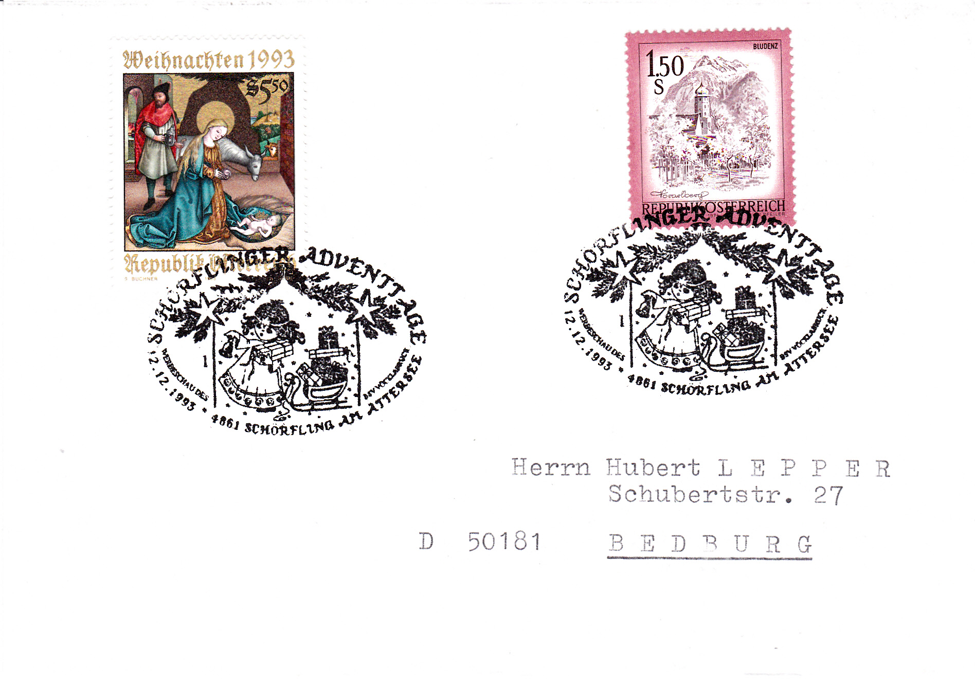Sonderstempel aus Schörfling am Attersee vom 12.12-1993 zu den Schörflinger Adventtagen mit der Kennziffer "1".