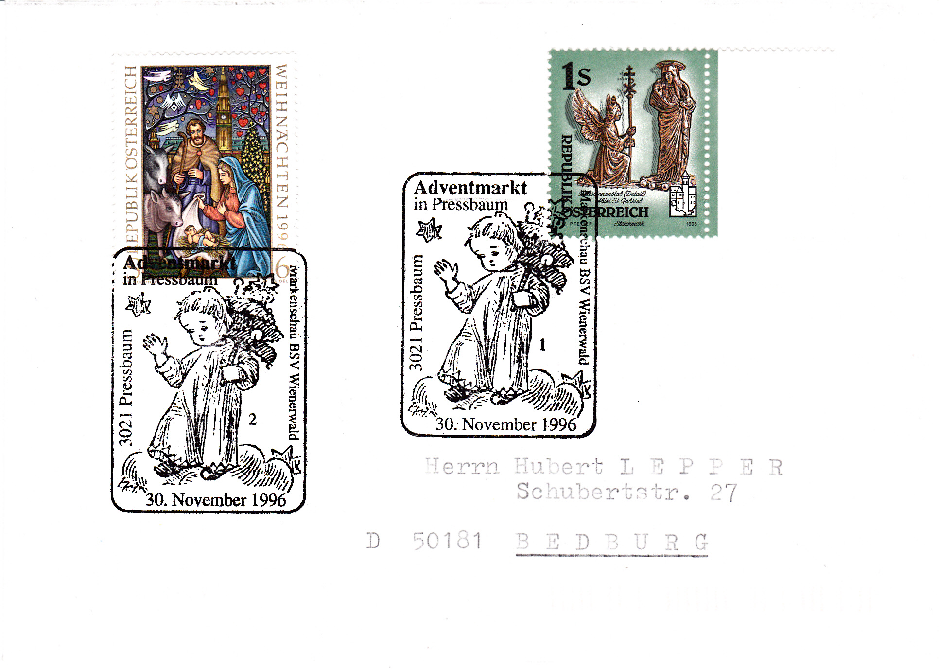 Sonderstempel aus A-3021 Pressbaum vom 30. November 1996 zum dortigen Adventmarkt. Die beiden Stempel haben die Kennziffer "1" und "2".