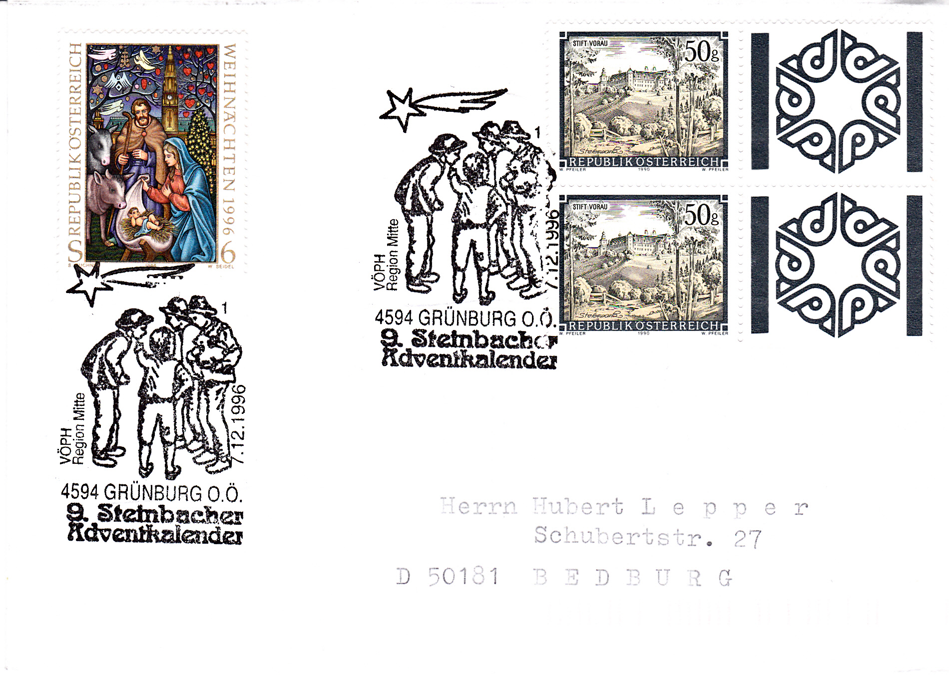 Sonderstempel aus Grünberg vom 7.12.1996 zum 9. Steinbacher Adventkalender mit der Kennziffer "1".