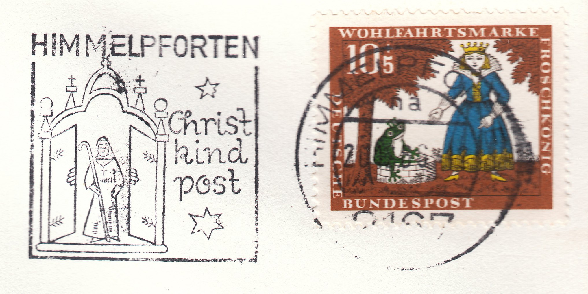 Hier ein Maschinenstempel aus HIMMELPFORTEN mit Werbeeinsatz "Christkindpost" aus dem Jahr 1966: