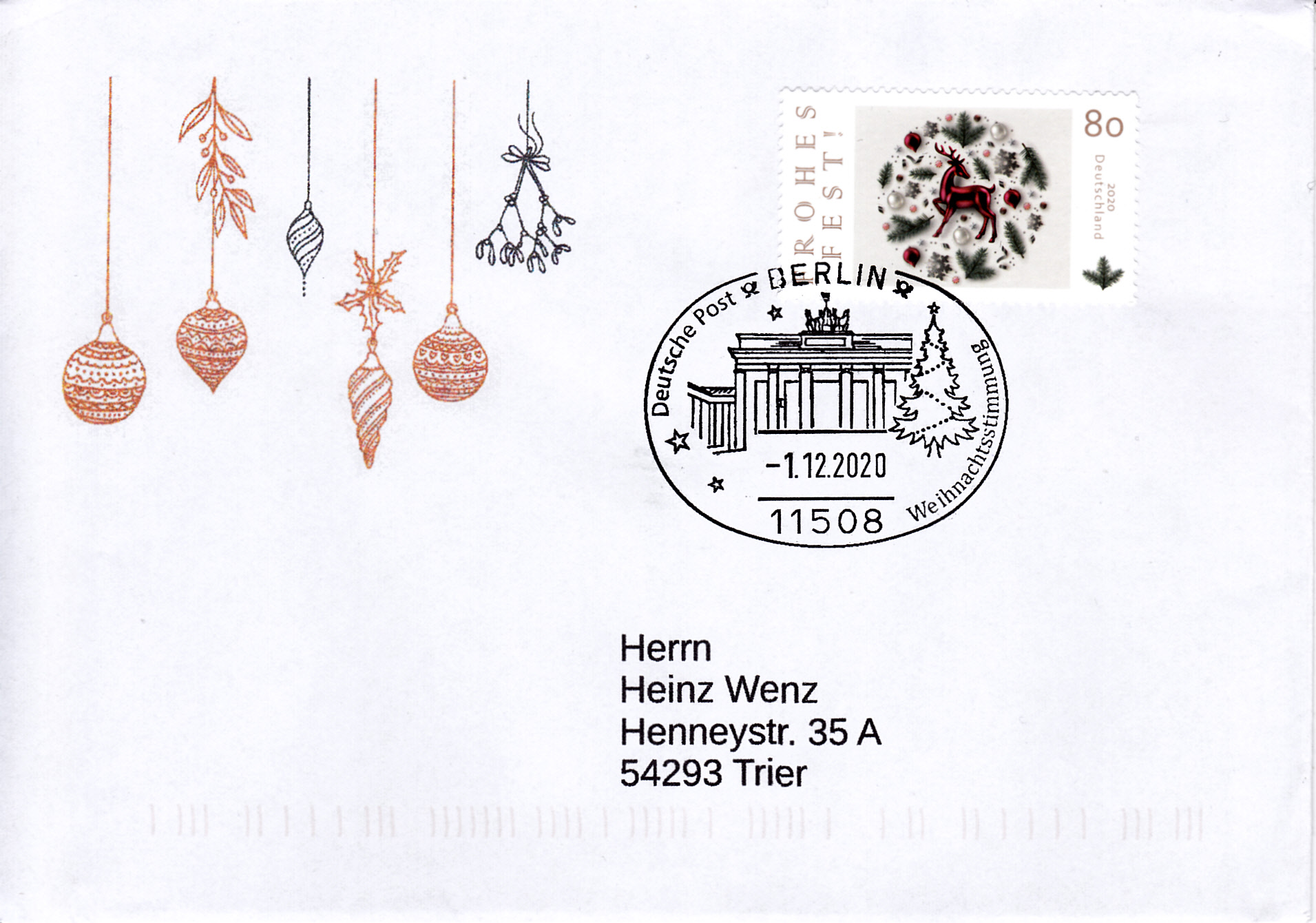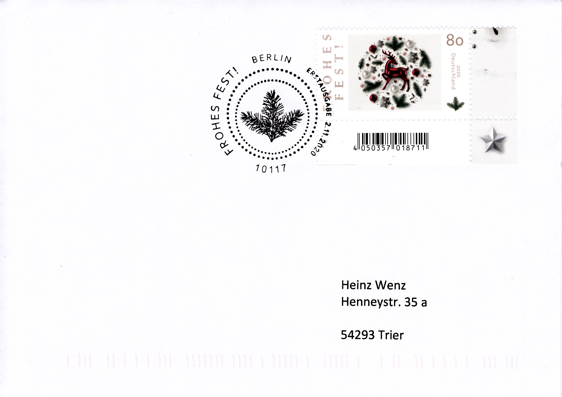 Faltbrief 210 mm x 102 mm mit Wertstempel der 80 Cent-Marke "Frohes Fest" (MiNr 3492) mit aufgedruckter Zähnung. Der Wertstempel ist mit einer Welle "Dialogpost" entwertet.