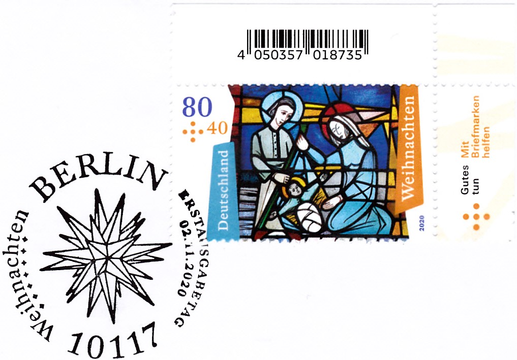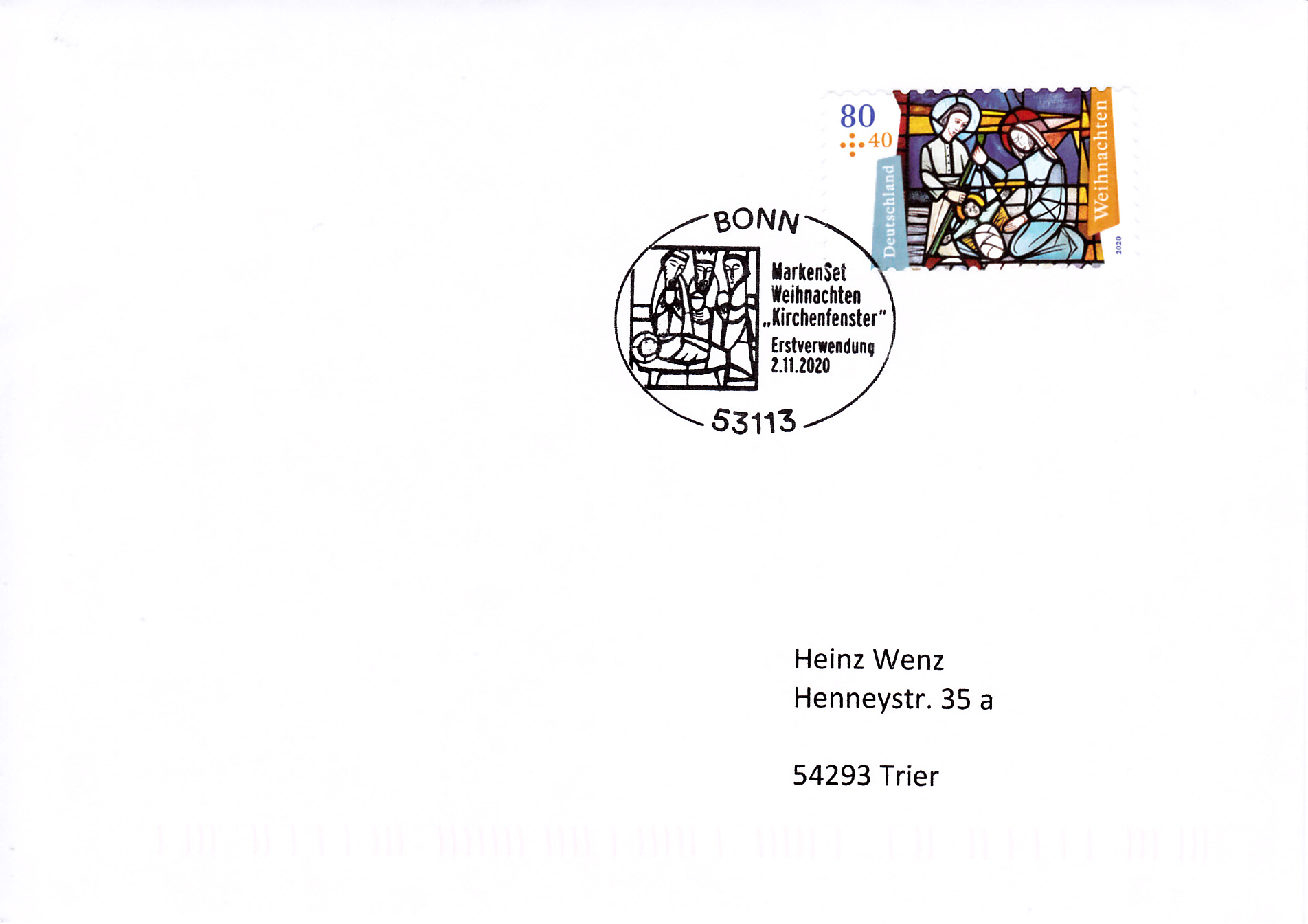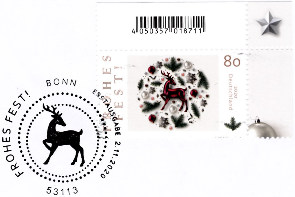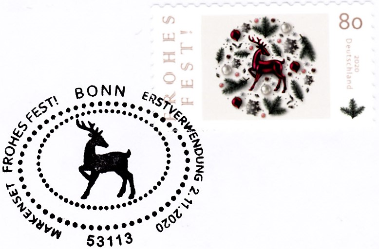 Für die selbstklebende Marke wurde ein eigener Erstverwendungsstempel Bonn eingesetzt. Und, sehr originell, er hat das gleiche Motiv wie der Ersttagsstempel!