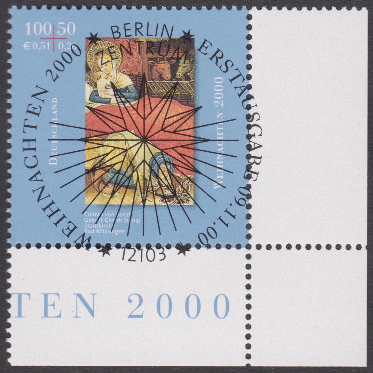 Eckrandstück oben links der Bund MiNr. 2151 mit EST POSTPHILATELIE FRANKFURT AM MAIN. Dargestellt wurde das Gemälde "Christi Geburt" von Conrad von Soest (um 1370-um 1423):