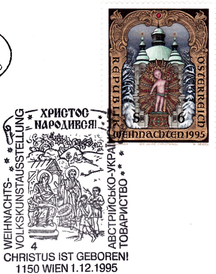 FDC mit der Weihnachtsmarke 1995 aus Österreich (MiNr 2176) und einem Sonderstempel aus Wien mit der Kennziffer "4" zu einer Weihnachts-Volkskunstausstellung.