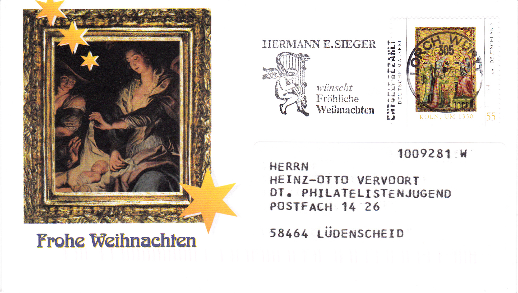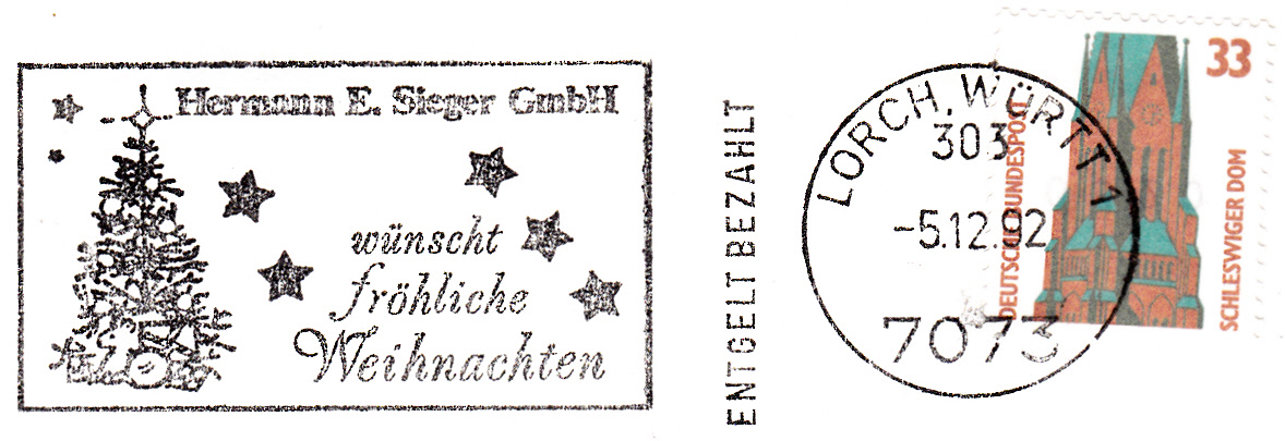 Absenderentwerterstempel der Firma Hermann E. Sieger mit dem Text "wünscht fröhliche Weihnachten" vom 11.10.1994. Da war die Firma aber sehr früh dran mit ihren Wünschen, oder sollte es ein Einstellungsfehler beim Datum sein?