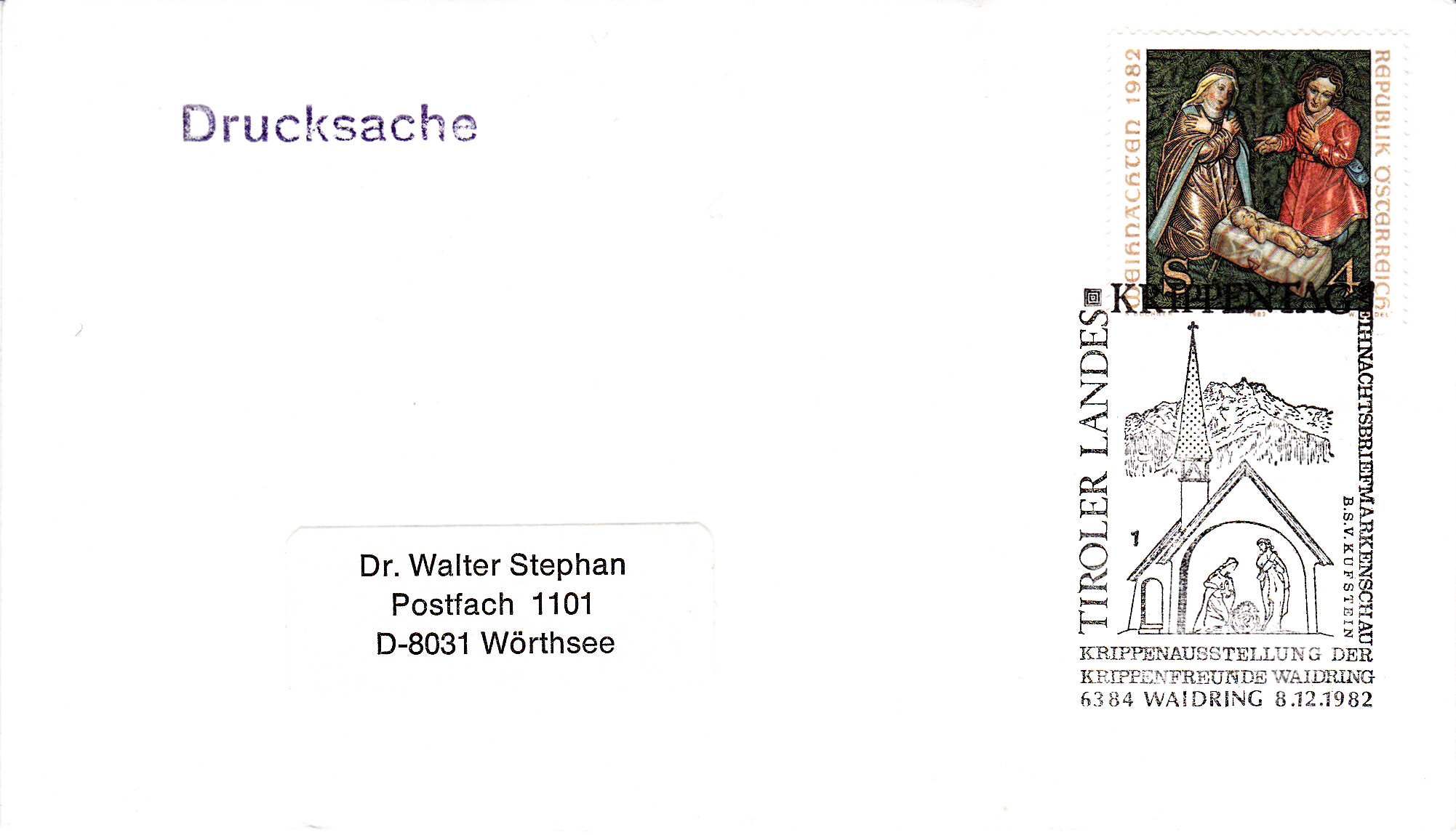 Sonderstempel aus Waidring vom 8.12.1982 zum Tiroler Landeskrippentag und der Krippenausstellung in Waidring. Der gezeigte Stempel hat die Kennziffer "1".