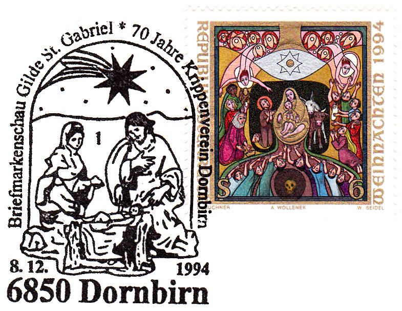 Dieser Sonderstempel aus Dornbirn vom 8.12.1994 feiert "70 Jahre Krippenverein Dornbirn". Er hat die Kennziffer "1".
