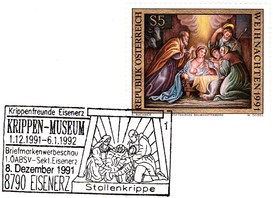 Dieser Sonderstempel vom 8.12.1991 aus Eisenerz zu einer Briefmarkenschau im Krippenmuseum zeigt eine Stollenkrippe im Stempelbild. Der Stempel hat die Kennziffer "1".
