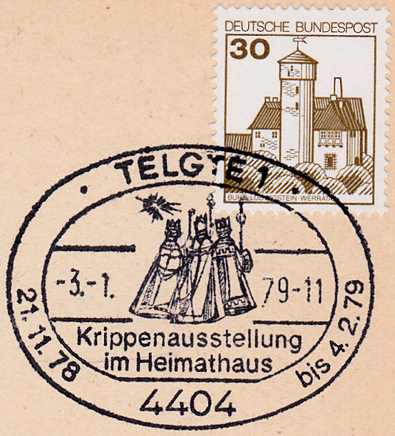 Dieser Handwerbestempel aus Telgte vom 3.1.1979 wurde zur Werbung für die Krippenausstellung im Heimathaus Telgte eingesetzt.